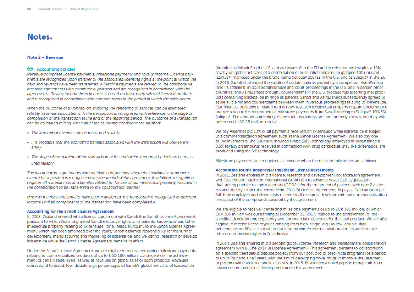 58 Zealand Pharma Annual Report 2017 Notes Note 2 Revenue (branded as Adlyxin® in the U.S. and as Lyxumia® in the EU and in other countries) plus a 10% royalty on global net sales of a combination of lixisenatide and insulin glargine 100 units/ml (Lantus®) marketed under the brand name Soliqua® 100/33 in the U.S. and as Suliqua® in the EU. In 2016, Sanofi challenged the validity of certain patents owned by a competitor, AstraZeneca (and its affiliates), in both administrative and court proceedings in the U.S. and in certain other countries, and AstraZeneca brought counterclaims in the U.S. proceedings asserting that prod-ucts containing lixisenatide infringe its patents. Sanofi and AstraZeneca subsequently agreed to settle all claims and counterclaims between them in various proceedings relating to lixisenatide. Our financial obligations related to this now-resolved intellectual property dispute could reduce our net revenue from commercial milestone payments from Sanofi relating to Soliqua® 100/33/ Suliqua®. The amount and timing of any such reductions are not currently known, but they will not exceed USD 15 million in total. Accounting policies Revenue comprises license payments, milestone payments and royalty income. License pay-ments are recognized upon transfer of the associated licensing rights at the point at which the risks and rewards have been transferred. Milestone payments are related to the collaborative research agreements with commercial partners and are recognized in accordance with the agreements. Royalty income from licenses is based on third-party sales of licensed products and is recognized in accordance with contract terms in the period in which the sales occur. When the outcome of a transaction involving the rendering of services can be estimated reliably, revenue associated with the transaction is recognized with reference to the stage of completion of the transaction at the end of the reporting period. The outcome of a transaction can be estimated reliably when all of the following conditions are satisfied: We pay Alkermes plc 13% of all payments received on lixisenatide while lixisenatide is subject to a commercialization agreement such as the Sanofi License Agreement. We also pay one of the inventors of the Structure Induced Probe (SIP) technology employed in lixisensatide a 0.5% royalty on amounts received in connection with drug candidates that, like lixisenatide, are produced using the SIP technology. The amount of revenue can be measured reliably It is probable that the economic benefits associated with the transaction will flow to the entity The stage of completion of the transaction at the end of the reporting period can be meas-ured reliably Milestone payments are recognized as revenue when the relevant milestones are achieved. Accounting for the Boehringer Ingelheim License Agreements In 2011, Zealand entered into a license, research and development collaboration agreement with Boehringer Ingelheim International GmbH (BI) to advance novel GLP-1/glucagon dual-acting peptide receptor agonists (GGDAs) for the treatment of patients with type 2 diabe-tes and obesity. Under the terms of the 2011 BI License Agreement, BI pays a fixed amount per full-time employee and other costs related to all research, development and commercialization in respect of the compounds covered by the agreement. The income from agreements with multiple components where the individual components cannot be separated is recognized over the period of the agreement. In addition, recognition requires all material risks and benefits related to the use of our intellectual property included in the collaboration to be transferred to the collaboration partner. If not all the risks and benefits have been transferred, the transaction is recognized as deferred income until all components of the transaction have been completed. We are eligible to receive license and milestone payments of up to EUR 386 million, of which EUR 365 million was outstanding at December 31, 2017, related to the achievement of pre-specified development, regulatory and commercial milestones for the lead product. We are also eligible to receive tiered royalties ranging from high-single-digit to low-double-digit percentages on BIs sales of all products stemming from this collaboration. In addition, we retain copromotion rights in Scandinavia. Accounting for the Sanofi License Agreement In 2003, Zealand entered into a license agreement with Sanofi (the Sanofi License Agreement), pursuant to which Zealand granted Sanofi exclusive rights to its patents, know-how and other intellectual property relating to lixisenatide, for all fields. Pursuant to the Sanofi License Agree-ment, which has been amended over the years, Sanofi assumed responsibility for the further development, manufacturing and marketing of lixisenatide, and we cannot research or develop lixisenatide while the Sanofi License Agreement remains in effect. In 2014, Zealand entered into a second global license, research and development collaboration agreement with BI (the 2014 BI License Agreement). This agreement pertains to collaboration on a specific therapeutic peptide project from our portfolio of preclinical programs for a period of up to four and a half years, with the aim of developing novel drugs to improve the treatment of patients with cardiometabolic diseases. In 2015, BI selected a novel peptide therapeutic to be advanced into preclinical development under this agreement. Under the Sanofi License Agreement, we are eligible to receive remaining milestone payments relating to commercialized products of up to USD 100 million, contingent on the achieve-ment of certain sales levels, as well as royalties on global sales of such products. Royalties correspond to tiered, low-double-digit percentages of Sanofis global net sales of lixisenatide