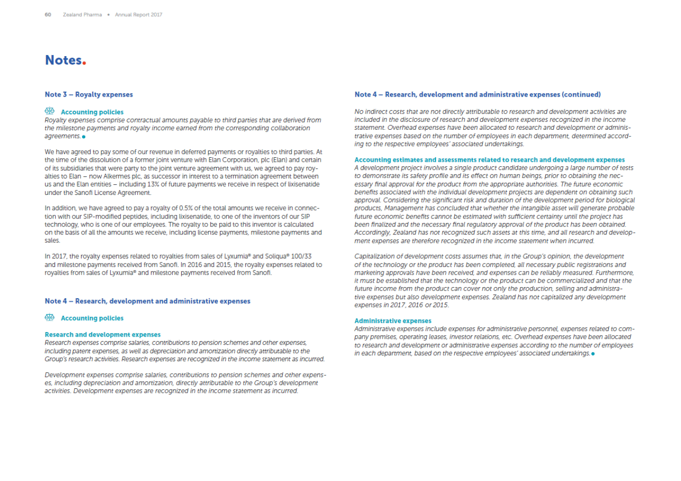 60 Zealand Pharma Annual Report 2017 Notes Note 3 Royalty expenses Note 4 Research, development and administrative expenses (continued) Accounting policies Royalty expenses comprise contractual amounts payable to third parties that are derived from the milestone payments and royalty income earned from the corresponding collaboration agreements. No indirect costs that are not directly attributable to research and development activities are included in the disclosure of research and development expenses recognized in the income statement. Overhead expenses have been allocated to research and development or adminis-trative expenses based on the number of employees in each department, determined accord-ing to the respective employees associated undertakings. We have agreed to pay some of our revenue in deferred payments or royalties to third parties. At the time of the dissolution of a former joint venture with Elan Corporation, plc (Elan) and certain of its subsidiaries that were party to the joint venture agreement with us, we agreed to pay roy-alties to Elan now Alkermes plc, as successor in interest to a termination agreement between us and the Elan entities including 13% of future payments we receive in respect of lixisenatide under the Sanofi License Agreement. Accounting estimates and assessments related to research and development expenses A development project involves a single product candidate undergoing a large number of tests to demonstrate its safety profile and its effect on human beings, prior to obtaining the nec-essary final approval for the product from the appropriate authorities. The future economic benefits associated with the individual development projects are dependent on obtaining such approval. Considering the significant risk and duration of the development period for biological products, Management has concluded that whether the intangible asset will generate probable future economic benefits cannot be estimated with sufficient certainty until the project has been finalized and the necessary final regulatory approval of the product has been obtained. Accordingly, Zealand has not recognized such assets at this time, and all research and develop-ment expenses are therefore recognized in the income statement when incurred. In addition, we have agreed to pay a royalty of 0.5% of the total amounts we receive in connec-tion with our SIP-modified peptides, including lixisenatide, to one of the inventors of our SIP technology, who is one of our employees. The royalty to be paid to this inventor is calculated on the basis of all the amounts we receive, including license payments, milestone payments and sales. In 2017, the royalty expenses related to royalties from sales of Lyxumia® and Soliqua® 100/33 and milestone payments received from Sanofi. In 2016 and 2015, the royalty expenses related to royalties from sales of Lyxumia® and milestone payments received from Sanofi. Capitalization of development costs assumes that, in the Groups opinion, the development of the technology or the product has been completed, all necessary public registrations and marketing approvals have been received, and expenses can be reliably measured. Furthermore, it must be established that the technology or the product can be commercialized and that the future income from the product can cover not only the production, selling and administra-tive expenses but also development expenses. Zealand has not capitalized any development expenses in 2017, 2016 or 2015. Note 4 Research, development and administrative expenses Accounting policies Administrative expenses Administrative expenses include expenses for administrative personnel, expenses related to com-pany premises, operating leases, investor relations, etc. Overhead expenses have been allocated to research and development or administrative expenses according to the number of employees in each department, based on the respective employees associated undertakings. Research and development expenses Research expenses comprise salaries, contributions to pension schemes and other expenses, including patent expenses, as well as depreciation and amortization directly attributable to the Groups research activities. Research expenses are recognized in the income statement as incurred. Development expenses comprise salaries, contributions to pension schemes and other expens-es, including depreciation and amortization, directly attributable to the Groups development activities. Development expenses are recognized in the income statement as incurred.