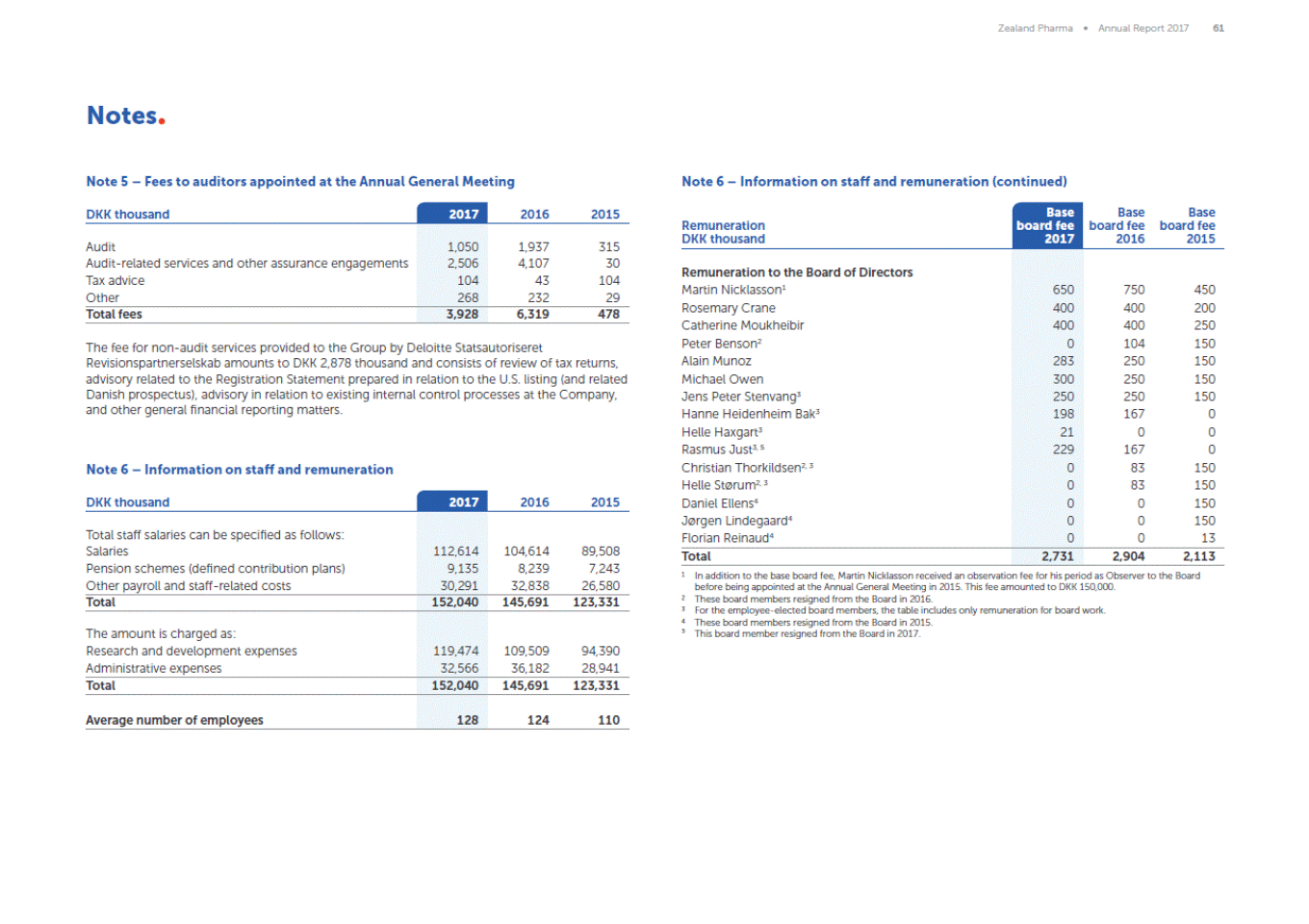 Zealand Pharma Annual Report 2017 61 Notes Note 5 Fees to auditors appointed at the Annual General Meeting Note 6 Information on staff and remuneration (continued) Base board fee 2017 Base board fee 2016 Base board fee 2015 DKK thousand 2017 2016 2015 Remuneration DKK thousand The fee for non-audit services provided to the Group by Deloitte Statsautoriseret Revisionspartnerselskab amounts to DKK 2,878 thousand and consists of review of tax returns, advisory related to the Registration Statement prepared in relation to the U.S. listing (and related Danish prospectus), advisory in relation to existing internal control processes at the Company, and other general financial reporting matters. Note 6 Information on staff and remuneration DKK thousand 2017 2016 2015 32,838 26,580 1 In addition to the base board fee, Martin Nicklasson received an observation fee for his period as Observer to the Board before being appointed at the Annual General Meeting in 2015. This fee amounted to DKK 150,000. These board members resigned from the Board in 2016. For the employee-elected board members, the table includes only remuneration for board work. These board members resigned from the Board in 2015. This board member resigned from the Board in 2017. 2 3 4 5 Total staff salaries can be specified as follows: Salaries Pension schemes (defined contribution plans) Other payroll and staff-related costs 112,614 9,135 30,291 104,61489,508 8,2397,243 Total 152,040 145,691 123,331 The amount is charged as: Research and development expenses Administrative expenses 119,474 32,566 109,50994,390 36,18228,941 Total 152,040 145,691 123,331 Average number of employees 128 124 110 Remuneration to the Board of Directors Martin Nicklasson1 Rosemary Crane Catherine Moukheibir Peter Benson2 Alain Munoz Michael Owen Jens Peter Stenvang3 Hanne Heidenheim Bak3 Helle Haxgart3 Rasmus Just3, 5 Christian Thorkildsen2, 3 Helle Størum2, 3 Daniel Ellens4 Jørgen Lindegaard4 Florian Reinaud4 650 400 400 0 283 300 250 198 21 229 0 0 0 0 0 750450 400200 400250 104150 250150 250150 250150 1670 00 1670 83150 83150 0150 0150 013 Total 2,731 2,904 2,113 Audit Audit-related services and other assurance engagements Tax advice Other 1,050 688 104 2,086 1,937315 82030 43104 3,51929 Total fees 3,928 6,319 478