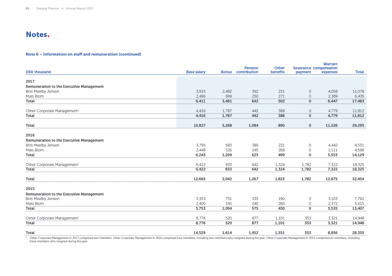62 Zealand Pharma Annual Report 2017 Notes Note 6 Information on staff and remuneration (continued) Warrant Severance compensation Pension contribution Other benefits DKK thousand Base salary Bonus payment expenses Total 2017 Remuneration to the Executive Management Britt Meelby Jensen Mats Blom 3,915 2,496 2,482 999 392 250 231 271 0 0 4,058 2,389 11,078 6,405 Total 6,411 3,481 642 502 0 6,447 17,483 Other Corporate Management1 4,416 1,787 442 388 0 4,779 11,812 Total 4,416 1,787 442 388 0 4,779 11,812 Total 10,827 5,268 1,084 890 0 11,226 29,295 2016 Remuneration to the Executive Management Britt Meelby Jensen Mats Blom Total 3,795 2,448 6,243 683 526 1,209 380 245 625 231 268 499 0 0 0 4,442 1,111 5,553 9,531 4,598 14,129 Other Corporate Management1 6,422 833 642 1,324 1,782 7,322 18,325 Total 6,422 833 642 1,324 1,782 7,322 18,325 Total 12,665 2,042 1,267 1,823 1,782 12,875 32,454 2015 Remuneration to the Executive Management Britt Meelby Jensen Mats Blom 3,353 2,400 751 343 335 240 190 260 0 0 3,163 2,372 7,792 5,615 Total 5,753 1,094 575 450 0 5,535 13,407 Other Corporate Management1 8,776 520 877 1,101 353 3,321 14,948 Total 8,776 520 877 1,101 353 3,321 14,948 Total 14,529 1,614 1,452 1,551 353 8,856 28,355 1 Other Corporate Management in 2017 comprised two members. Other Corporate Management in 2016 comprised four members, including two members who resigned during the year. Other Corporate Management in 2015 comprised six members, including three members who resigned during the year.