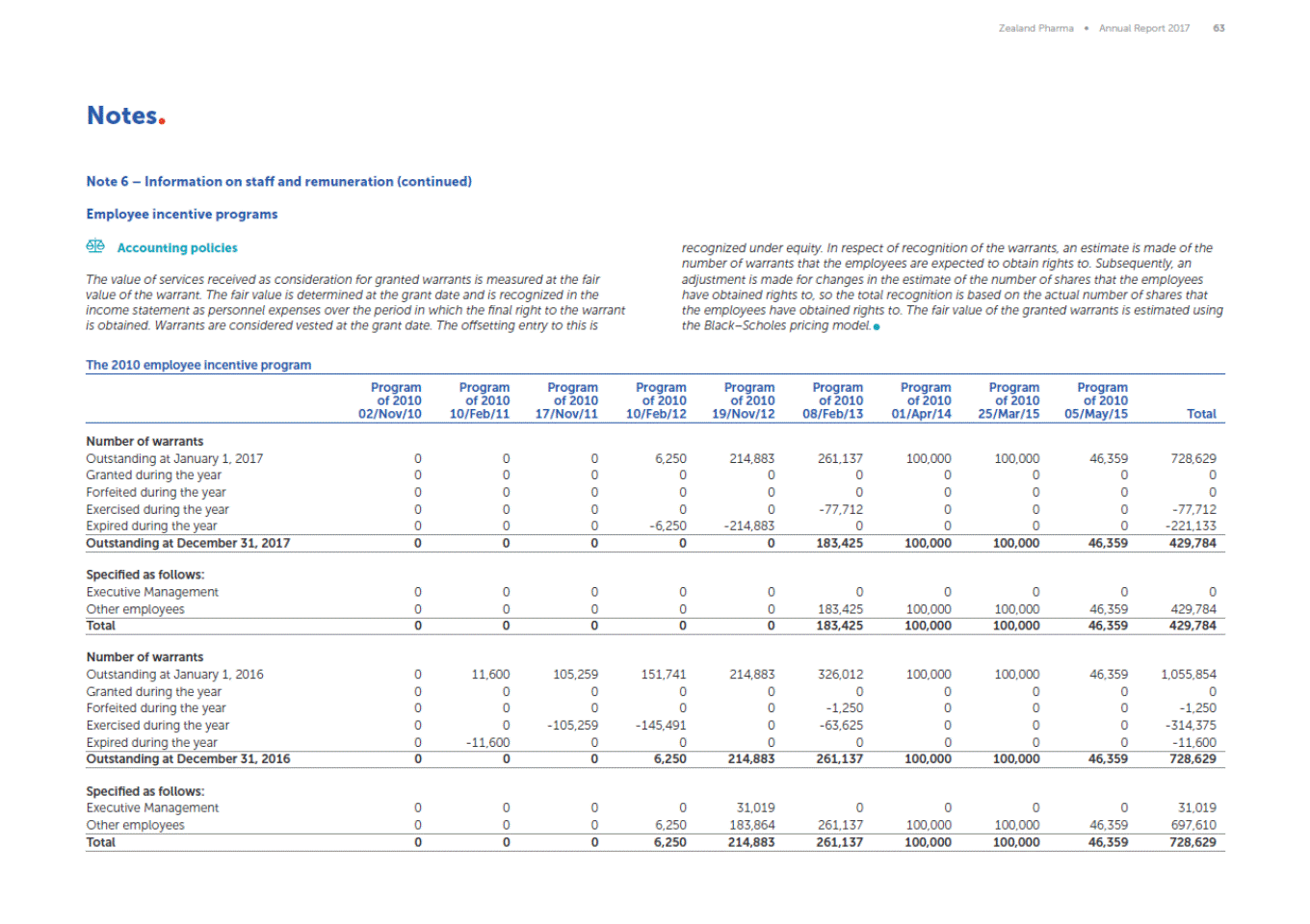 Zealand Pharma Annual Report 2017 63 Notes Note 6 Information on staff and remuneration (continued) Employee incentive programs Accounting policies recognized under equity. In respect of recognition of the warrants, an estimate is made of the number of warrants that the employees are expected to obtain rights to. Subsequently, an adjustment is made for changes in the estimate of the number of shares that the employees have obtained rights to, so the total recognition is based on the actual number of shares that the employees have obtained rights to. The fair value of the granted warrants is estimated using the BlackScholes pricing model. The value of services received as consideration for granted warrants is measured at the fair value of the warrant. The fair value is determined at the grant date and is recognized in the income statement as personnel expenses over the period in which the final right to the warrant is obtained. Warrants are considered vested at the grant date. The offsetting entry to this is The 2010 employee incentive program Program of 2010 02/Nov/10 Program of 2010 10/Feb/11 Program of 2010 17/Nov/11 Program of 2010 10/Feb/12 Program of 2010 19/Nov/12 Program of 2010 08/Feb/13 Program of 2010 01/Apr/14 Program of 2010 25/Mar/15 Program of 2010 05/May/15 Total Number of warrants Outstanding at January 1, 2017 Granted during the year Forfeited during the year Exercised during the year Expired during the year 0 0 0 0 0 0 0 0 0 0 0 0 0 0 0 6,250 0 0 0 -6,250 214,883 0 0 0 -214,883 261,137 0 0 -77,712 0 100,000 0 0 0 0 100,000 0 0 0 0 46,359 0 0 0 0 728,629 0 0 -77,712 -221,133 Outstanding at December 31, 2017 0 0 0 0 0 183,425 100,000 100,000 46,359 429,784 Specified as follows: Executive Management Other employees 0 0 0 0 0 0 0 0 0 0 0 183,425 0 100,000 0 100,000 0 46,359 0 429,784 Total 0 0 0 0 0 183,425 100,000 100,000 46,359 429,784 Number of warrants Outstanding at January 1, 2016 Granted during the year Forfeited during the year Exercised during the year Expired during the year 0 0 0 0 0 11,600 0 0 0 -11,600 105,259 0 0 -105,259 0 151,741 0 0 -145,491 0 214,883 0 0 0 0 326,012 0 -1,250 -63,625 0 100,000 0 0 0 0 100,000 0 0 0 0 46,359 0 0 0 0 1,055,854 0 -1,250 -314,375 -11,600 Outstanding at December 31, 2016 0 0 0 6,250 214,883 261,137 100,000 100,000 46,359 728,629 Specified as follows: Executive Management Other employees 0 0 0 0 0 0 0 6,250 31,019 183,864 0 261,137 0 100,000 0 100,000 0 46,359 31,019 697,610 Total 0 0 0 6,250 214,883 261,137 100,000 100,000 46,359 728,629