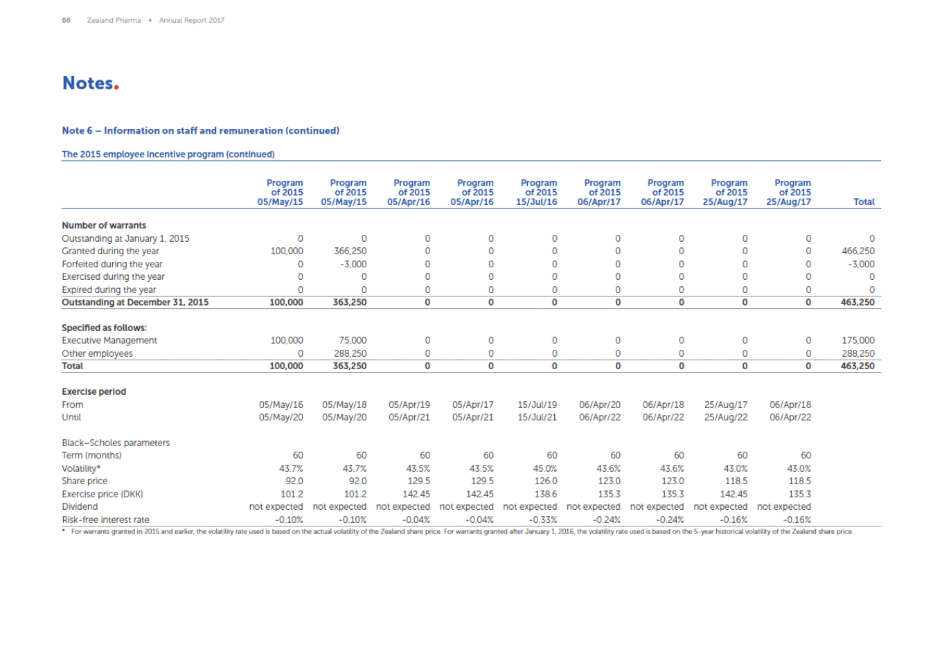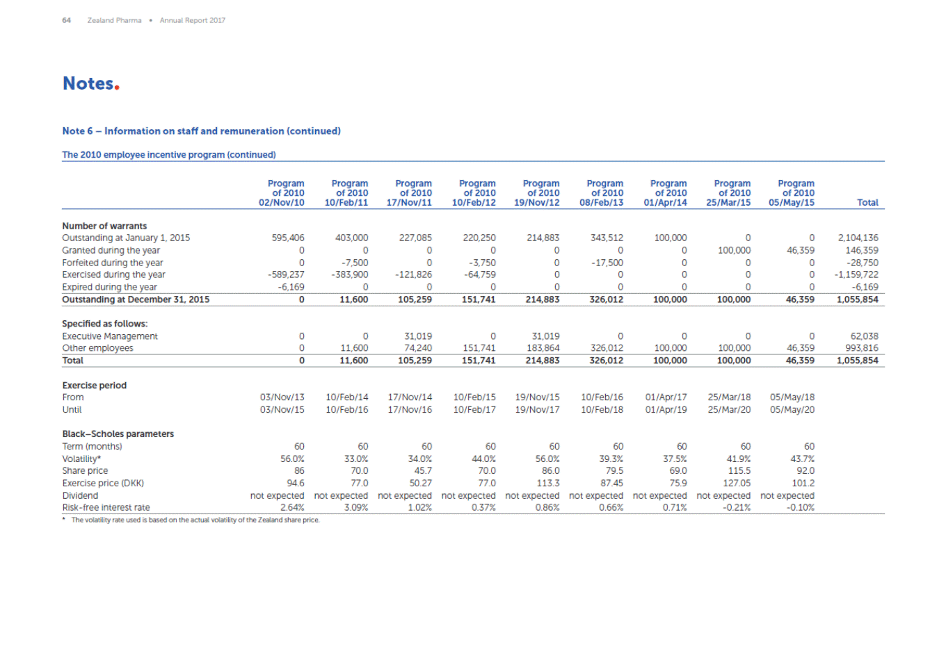 64 Zealand Pharma Annual Report 2017 Notes Note 6 Information on staff and remuneration (continued) The 2010 employee incentive program (continued) Program of 2010 02/Nov/10 Program of 2010 10/Feb/11 Program of 2010 17/Nov/11 Program of 2010 10/Feb/12 Program of 2010 19/Nov/12 Program of 2010 08/Feb/13 Program of 2010 01/Apr/14 Program of 2010 25/Mar/15 Program of 2010 05/May/15 Total Number of warrants Outstanding at January 1, 2015 Granted during the year Forfeited during the year Exercised during the year Expired during the year 595,406 0 0 -589,237 -6,169 403,000 0 -7,500 -383,900 0 227,085 0 0 -121,826 0 220,250 0 -3,750 -64,759 0 214,883 0 0 0 0 343,512 0 -17,500 0 0 100,000 0 0 0 0 0 100,000 0 0 0 0 46,359 0 0 0 2,104,136 146,359 -28,750 -1,159,722 -6,169 Outstanding at December 31, 2015 0 11,600 105,259 151,741 214,883 326,012 100,000 100,000 46,359 1,055,854 Specified as follows: Executive Management Other employees 0 0 0 11,600 31,019 74,240 0 151,741 31,019 183,864 0 326,012 0 100,000 0 100,000 0 46,359 62,038 993,816 Total 0 11,600 105,259 151,741 214,883 326,012 100,000 100,000 46,359 1,055,854 Exercise period From Until 03/Nov/13 03/Nov/15 10/Feb/14 10/Feb/16 17/Nov/14 17/Nov/16 10/Feb/15 10/Feb/17 19/Nov/15 19/Nov/17 10/Feb/16 10/Feb/18 01/Apr/17 01/Apr/19 25/Mar/18 25/Mar/20 05/May/18 05/May/20 BlackScholes parameters Term (months) Volatility* Share price Exercise price (DKK) Dividend Risk-free interest rate 60 56.0% 86 94.6 not expected 2.64% 60 33.0% 70.0 77.0 not expected 3.09% 60 34.0% 45.7 50.27 not expected 1.02% 60 44.0% 70.0 77.0 not expected 0.37% 60 56.0% 86.0 113.3 not expected 0.86% 60 39.3% 79.5 87.45 not expected 0.66% 60 37.5% 69.0 75.9 not expected 0.71% 60 41.9% 115.5 127.05 not expected -0.21% 60 43.7% 92.0 101.2 not expected -0.10% * The volatility rate used is based on the actual volatility of the Zealand share price.