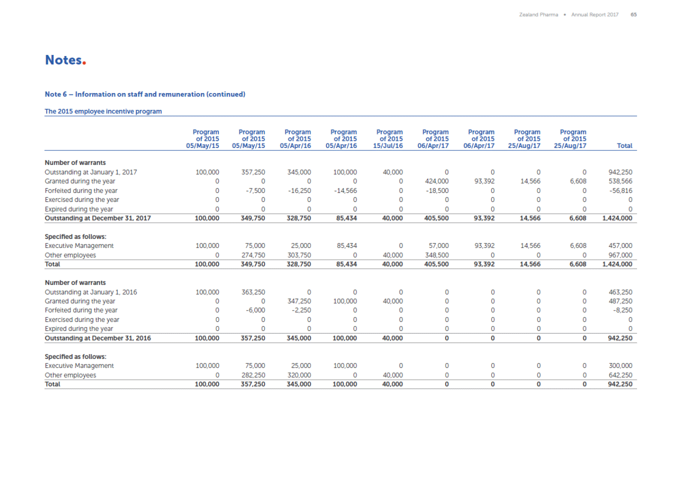 Zealand Pharma Annual Report 2017 65 Notes Note 6 Information on staff and remuneration (continued) The 2015 employee incentive program Program of 2015 05/May/15 Program of 2015 05/May/15 Program of 2015 05/Apr/16 Program of 2015 05/Apr/16 Program of 2015 15/Jul/16 Program of 2015 06/Apr/17 Program of 2015 06/Apr/17 Program of 2015 25/Aug/17 Program of 2015 25/Aug/17 Total Number of warrants Outstanding at January 1, 2017 Granted during the year Forfeited during the year Exercised during the year Expired during the year 100,000 0 0 0 0 357,250 0 -7,500 0 0 345,000 0 -16,250 0 0 100,000 0 -14,566 0 0 40,000 0 0 0 0 0 424,000 -18,500 0 0 0 93,392 0 0 0 0 14,566 0 0 0 0 6,608 0 0 0 942,250 538,566 -56,816 0 0 Outstanding at December 31, 2017 100,000 349,750 328,750 85,434 40,000 405,500 93,392 14,566 6,608 1,424,000 Specified as follows: Executive Management Other employees 100,000 0 75,000 274,750 25,000 303,750 85,434 0 0 40,000 57,000 348,500 93,392 0 14,566 0 6,608 0 457,000 967,000 Total 100,000 349,750 328,750 85,434 40,000 405,500 93,392 14,566 6,608 1,424,000 Number of warrants Outstanding at January 1, 2016 Granted during the year Forfeited during the year Exercised during the year Expired during the year 100,000 0 0 0 0 363,250 0 -6,000 0 0 0 347,250 -2,250 0 0 0 100,000 0 0 0 0 40,000 0 0 0 0 0 0 0 0 0 0 0 0 0 0 0 0 0 0 0 0 0 0 0 463,250 487,250 -8,250 0 0 Outstanding at December 31, 2016 100,000 357,250 345,000 100,000 40,000 0 0 0 0 942,250 Specified as follows: Executive Management Other employees 100,000 0 75,000 282,250 25,000 320,000 100,000 0 0 40,000 0 0 0 0 0 0 0 0 300,000 642,250 Total 100,000 357,250 345,000 100,000 40,000 0 0 0 0 942,250