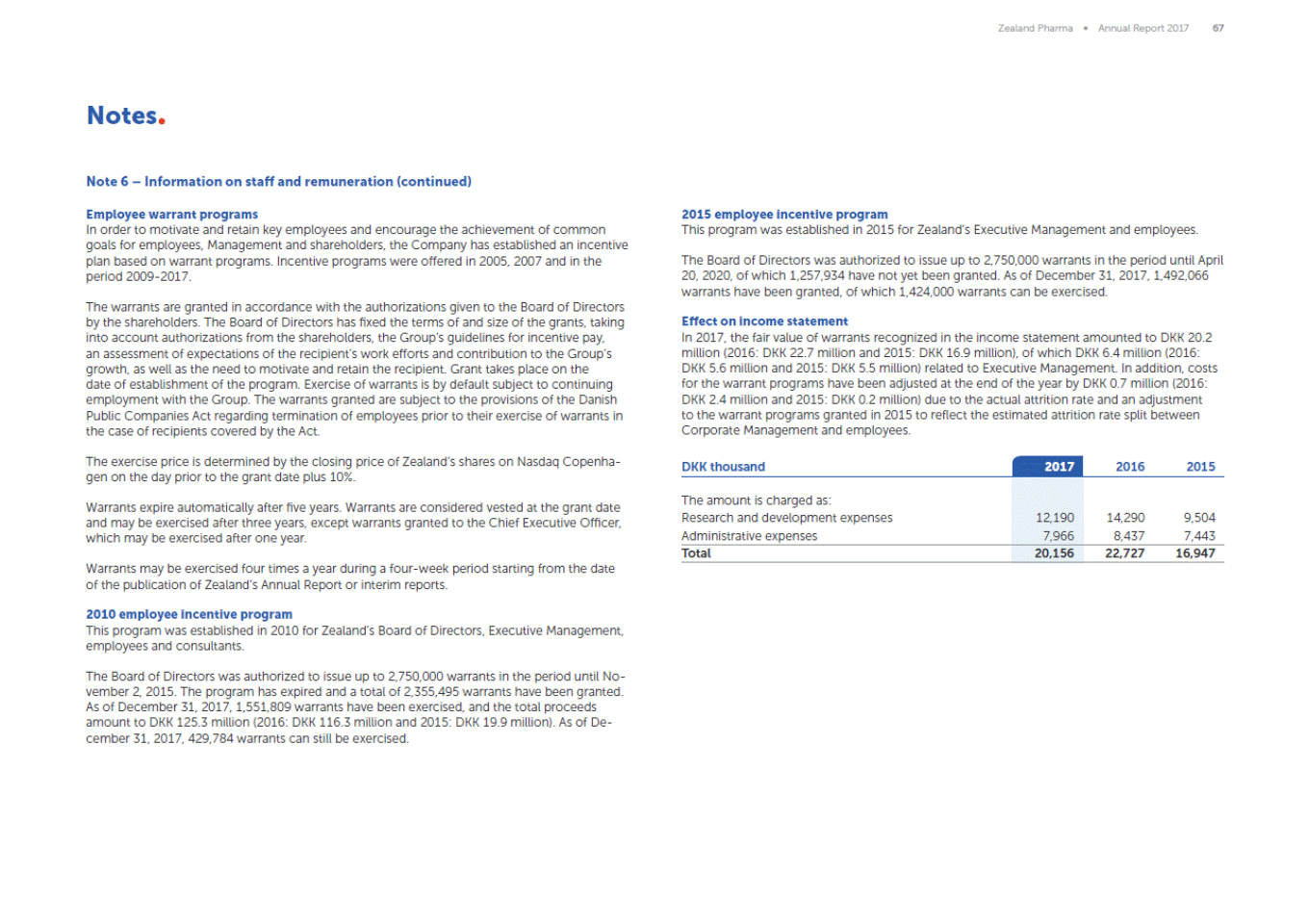 Zealand Pharma Annual Report 201767 Notes Note 6 Information on staff and remuneration (continued) Employee warrant programs In order to motivate and retain key employees and encourage the achievement of common goals for employees, Management and shareholders, the Company has established an incentive plan based on warrant programs. Incentive programs were offered in 2005, 2007 and in the period 2009-2017. 2015 employee incentive program This program was established in 2015 for Zealands Executive Management and employees. The Board of Directors was authorized to issue up to 2,750,000 warrants in the period until April 20, 2020, of which 1,257,934 have not yet been granted. As of December 31, 2017, 1,492,066 warrants have been granted, of which 1,424,000 warrants can be exercised. The warrants are granted in accordance with the authorizations given to the Board of Directors by the shareholders. The Board of Directors has fixed the terms of and size of the grants, taking into account authorizations from the shareholders, the Groups guidelines for incentive pay, an assessment of expectations of the recipients work efforts and contribution to the Groups growth, as well as the need to motivate and retain the recipient. Grant takes place on the date of establishment of the program. Exercise of warrants is by default subject to continuing employment with the Group. The warrants granted are subject to the provisions of the Danish Public Companies Act regarding termination of employees prior to their exercise of warrants in the case of recipients covered by the Act. Effect on income statement In 2017, the fair value of warrants recognized in the income statement amounted to DKK 20.2 million (2016: DKK 22.7 million and 2015: DKK 16.9 million), of which DKK 6.4 million (2016: DKK 5.6 million and 2015: DKK 5.5 million) related to Executive Management. In addition, costs for the warrant programs have been adjusted at the end of the year by DKK 0.7 million (2016: DKK 2.4 million and 2015: DKK 0.2 million) due to the actual attrition rate and an adjustment to the warrant programs granted in 2015 to reflect the estimated attrition rate split between Corporate Management and employees. The exercise price is determined by the closing price of Zealands shares on Nasdaq Copenha-gen on the day prior to the grant date plus 10%. DKK thousand 2017 2016 2015 Warrants expire automatically after five years. Warrants are considered vested at the grant date and may be exercised after three years, except warrants granted to the Chief Executive Officer, which may be exercised after one year. Warrants may be exercised four times a year during a four-week period starting from the date of the publication of Zealands Annual Report or interim reports. 2010 employee incentive program This program was established in 2010 for Zealands Board of Directors, Executive Management, employees and consultants. The Board of Directors was authorized to issue up to 2,750,000 warrants in the period until No-vember 2, 2015. The program has expired and a total of 2,355,495 warrants have been granted. As of December 31, 2017, 1,551,809 warrants have been exercised, and the total proceeds amount to DKK 125.3 million (2016: DKK 116.3 million and 2015: DKK 19.9 million). As of De-cember 31, 2017, 429,784 warrants can still be exercised. The amount is charged as: Research and development expenses Administrative expenses 12,190 7,966 14,2909,504 8,4377,443 Total 20,156 22,727 16,947
