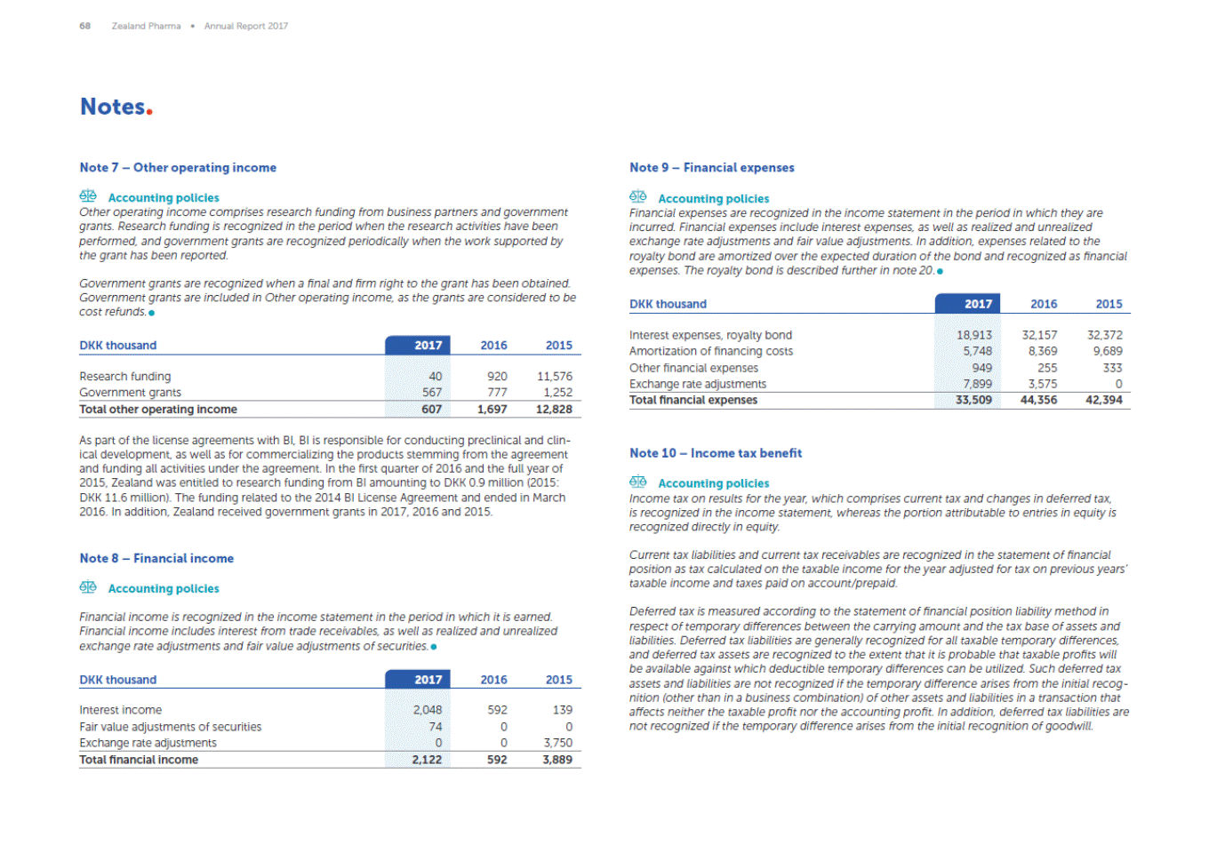 68 Zealand Pharma Annual Report 2017 Notes Note 7 Other operating income Note 9 Financial expenses Accounting policies Other operating income comprises research funding from business partners and government grants. Research funding is recognized in the period when the research activities have been performed, and government grants are recognized periodically when the work supported by the grant has been reported. Accounting policies Financial expenses are recognized in the income statement in the period in which they are incurred. Financial expenses include interest expenses, as well as realized and unrealized exchange rate adjustments and fair value adjustments. In addition, expenses related to the royalty bond are amortized over the expected duration of the bond and recognized as financial expenses. The royalty bond is described further in note 20. Government grants are recognized when a final and firm right to the grant has been obtained. Government grants are included in Other operating income, as the grants are considered to be cost refunds. DKK thousand 2017 2016 2015 DKK thousand 2017 2016 2015 777 1,252 As part of the license agreements with BI, BI is responsible for conducting preclinical and clin-ical development, as well as for commercializing the products stemming from the agreement and funding all activities under the agreement. In the first quarter of 2016 and the full year of 2015, Zealand was entitled to research funding from BI amounting to DKK 0.9 million (2015: DKK 11.6 million). The funding related to the 2014 BI License Agreement and ended in March 2016. In addition, Zealand received government grants in 2017, 2016 and 2015. Note 10 Income tax benefit Accounting policies Income tax on results for the year, which comprises current tax and changes in deferred tax, is recognized in the income statement, whereas the portion attributable to entries in equity is recognized directly in equity. Current tax liabilities and current tax receivables are recognized in the statement of financial position as tax calculated on the taxable income for the year adjusted for tax on previous years taxable income and taxes paid on account/prepaid. Note 8 Financial income Accounting policies Deferred tax is measured according to the statement of financial position liability method in respect of temporary differences between the carrying amount and the tax base of assets and liabilities. Deferred tax liabilities are generally recognized for all taxable temporary differences, and deferred tax assets are recognized to the extent that it is probable that taxable profits will be available against which deductible temporary differences can be utilized. Such deferred tax assets and liabilities are not recognized if the temporary difference arises from the initial recog-nition (other than in a business combination) of other assets and liabilities in a transaction that affects neither the taxable profit nor the accounting profit. In addition, deferred tax liabilities are not recognized if the temporary difference arises from the initial recognition of goodwill. Financial income is recognized in the income statement in the period in which it is earned. Financial income includes interest from trade receivables, as well as realized and unrealized exchange rate adjustments and fair value adjustments of securities. DKK thousand 2017 2016 2015 Interest income Fair value adjustments of securities Exchange rate adjustments 2,048 74 0 592139 00 03,750 Total financial income 2,122 592 3,889 Research funding Government grants 40 567 92011,576 Total other operating income 607 1,697 12,828 Interest expenses, royalty bond Amortization of financing costs Other financial expenses Exchange rate adjustments 18,913 5,748 949 7,899 32,15732,372 8,3699,689 255333 3,5750 Total financial expenses 33,509 44,356 42,394