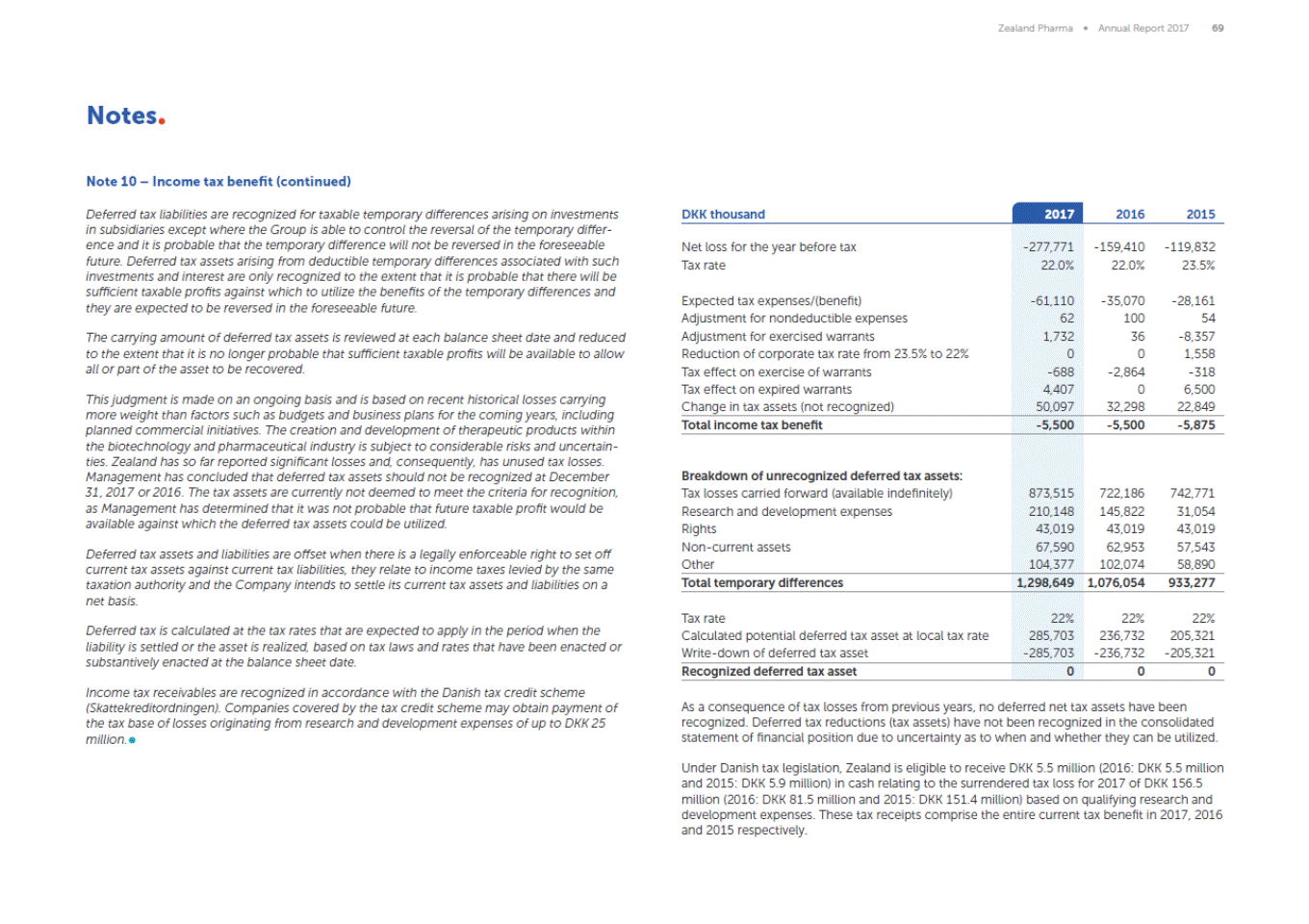Zealand Pharma Annual Report 2017 69 Notes Note 10 Income tax benefit (continued) Deferred tax liabilities are recognized for taxable temporary differences arising on investments in subsidiaries except where the Group is able to control the reversal of the temporary differ-ence and it is probable that the temporary difference will not be reversed in the foreseeable future. Deferred tax assets arising from deductible temporary differences associated with such investments and interest are only recognized to the extent that it is probable that there will be sufficient taxable profits against which to utilize the benefits of the temporary differences and they are expected to be reversed in the foreseeable future. DKK thousand 2017 2016 2015 The carrying amount of deferred tax assets is reviewed at each balance sheet date and reduced to the extent that it is no longer probable that sufficient taxable profits will be available to allow all or part of the asset to be recovered. This judgment is made on an ongoing basis and is based on recent historical losses carrying more weight than factors such as budgets and business plans for the coming years, including planned commercial initiatives. The creation and development of therapeutic products within the biotechnology and pharmaceutical industry is subject to considerable risks and uncertain-ties. Zealand has so far reported significant losses and, consequently, has unused tax losses. Management has concluded that deferred tax assets should not be recognized at December 31, 2017 or 2016. The tax assets are currently not deemed to meet the criteria for recognition, as Management has determined that it was not probable that future taxable profit would be available against which the deferred tax assets could be utilized. Deferred tax assets and liabilities are offset when there is a legally enforceable right to set off current tax assets against current tax liabilities, they relate to income taxes levied by the same taxation authority and the Company intends to settle its current tax assets and liabilities on a net basis. Deferred tax is calculated at the tax rates that are expected to apply in the period when the liability is settled or the asset is realized, based on tax laws and rates that have been enacted or substantively enacted at the balance sheet date. Income tax receivables are recognized in accordance with the Danish tax credit scheme (Skattekreditordningen). Companies covered by the tax credit scheme may obtain payment of the tax base of losses originating from research and development expenses of up to DKK 25 million. As a consequence of tax losses from previous years, no deferred net tax assets have been recognized. Deferred tax reductions (tax assets) have not been recognized in the consolidated statement of financial position due to uncertainty as to when and whether they can be utilized. Under Danish tax legislation, Zealand is eligible to receive DKK 5.5 million (2016: DKK 5.5 million and 2015: DKK 5.9 million) in cash relating to the surrendered tax loss for 2017 of DKK 156.5 million (2016: DKK 81.5 million and 2015: DKK 151.4 million) based on qualifying research and development expenses. These tax receipts comprise the entire current tax benefit in 2017, 2016 and 2015 respectively. Net loss for the year before tax Tax rate Expected tax expenses/(benefit) Adjustment for nondeductible expenses Adjustment for exercised warrants Reduction of corporate tax rate from 23.5% to 22% Tax effect on exercise of warrants Tax effect on expired warrants Change in tax assets (not recognized) -277,771 22.0% -61,110 62 1,732 0 -688 4,407 50,097 -159,410-119,832 22.0%23.5% -35,070-28,161 10054 36-8,357 01,558 -2,864-318 06,500 32,29822,849 Total income tax benefit -5,500 -5,500 -5,875 Breakdown of unrecognized deferred tax assets: Tax losses carried forward (available indefinitely) Research and development expenses Rights Non-current assets Other 873,515 210,148 43,019 67,590 104,377 722,186742,771 145,82231,054 43,01943,019 62,95357,543 102,07458,890 Total temporary differences 1,298,649 1,076,054 933,277 Tax rate Calculated potential deferred tax asset at local tax rate Write-down of deferred tax asset 22% 285,703 -285,703 22%22% 236,732205,321 -236,732-205,321 Recognized deferred tax asset 0 0 0