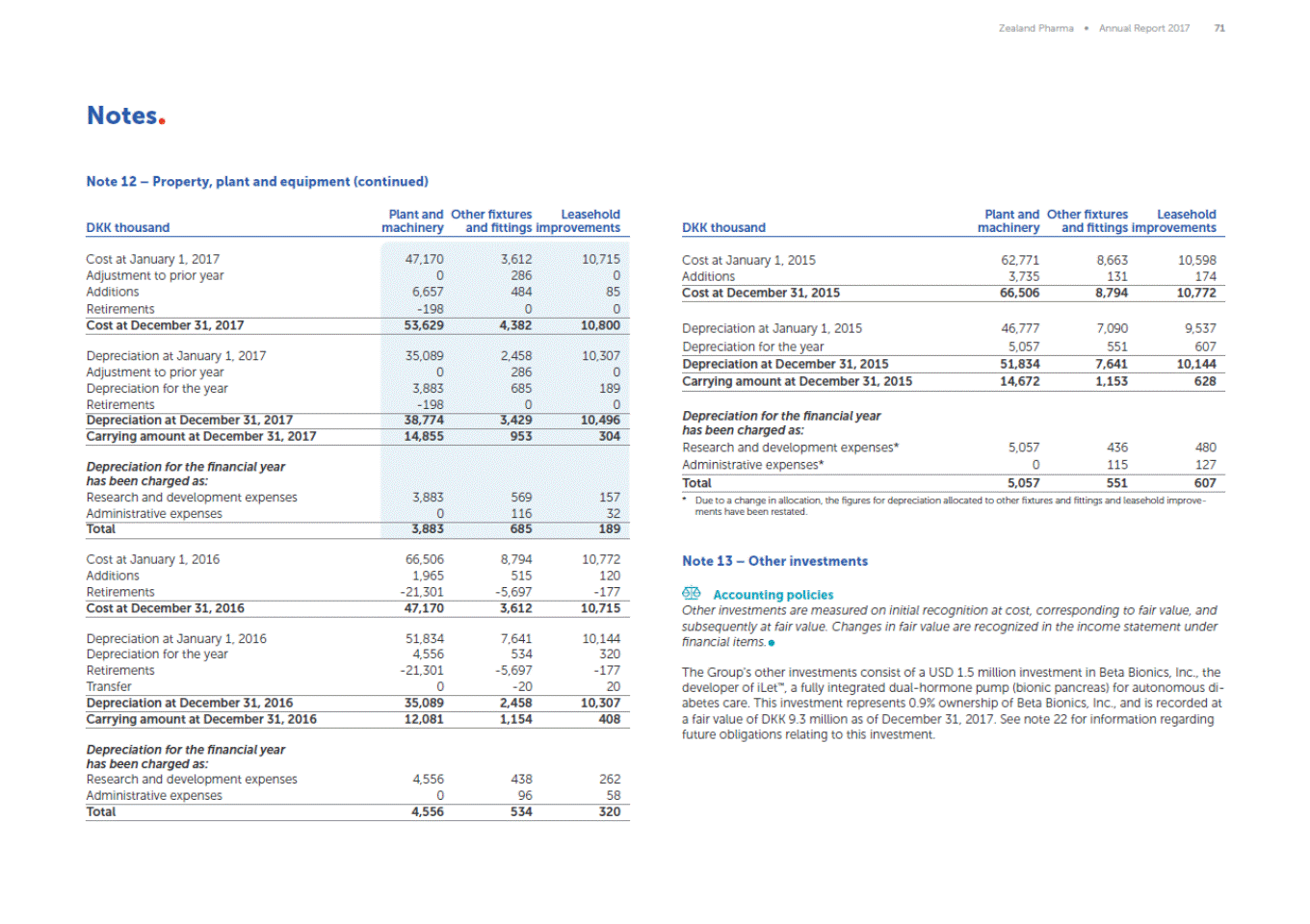 Zealand Pharma Annual Report 2017 71 Notes Note 12 Property, plant and equipment (continued) Plant and Other fixtures Leasehold Plant and Other fixtures Leasehold DKK thousand machinery and fittings improvements DKK thousand machinery and fittings improvements Cost at January 1, 2017 Adjustment to prior year Additions Retirements 47,170 0 6,657 -198 3,612 286 484 0 10,715 0 85 0 Cost at January 1, 2015 Additions 62,771 3,735 8,663 131 10,598 174 Cost at December 31, 2015 66,506 8,794 10,772 Cost at December 31, 2017 53,629 4,382 10,800 Depreciation at January 1, 2015 Depreciation for the year 46,777 5,057 7,090 551 9,537 607 Depreciation at January 1, 2017 Adjustment to prior year Depreciation for the year Retirements 35,089 0 3,883 -198 2,458 286 685 0 10,307 0 189 0 Depreciation at December 31, 2015 51,834 7,641 10,144 Carrying amount at December 31, 2015 14,672 1,153 628 Depreciation for the financial year has been charged as: Research and development expenses* Administrative expenses* Depreciation at December 31, 2017 38,774 3,429 10,496 Carrying amount at December 31, 2017 14,855 953 304 5,057 0 436 115 480 127 Depreciation for the financial year has been charged as: Research and development expenses Administrative expenses Total 5,057 551 607 3,883 0 569 116 157 32 * Due to a change in allocation, the figures for depreciation allocated to other fixtures and fittings and leasehold improve-ments have been restated. Total 3,883 685 189 Cost at January 1, 2016 Additions Retirements 66,506 1,965 -21,301 8,794 515 -5,697 10,772 120 -177 Note 13 Other investments Accounting policies Other investments are measured on initial recognition at cost, corresponding to fair value, and subsequently at fair value. Changes in fair value are recognized in the income statement under financial items. Cost at December 31, 2016 47,170 3,612 10,715 Depreciation at January 1, 2016 Depreciation for the year Retirements Transfer 51,834 4,556 -21,301 0 7,641 534 -5,697 -20 10,144 320 -177 20 The Groups other investments consist of a USD 1.5 million investment in Beta Bionics, Inc., the developer of iLet, a fully integrated dual-hormone pump (bionic pancreas) for autonomous di-abetes care. This investment represents 0.9% ownership of Beta Bionics, Inc., and is recorded at a fair value of DKK 9.3 million as of December 31, 2017. See note 22 for information regarding future obligations relating to this investment. Depreciation at December 31, 2016 35,089 2,458 10,307 Carrying amount at December 31, 2016 12,081 1,154 408 Depreciation for the financial year has been charged as: Research and development expenses Administrative expenses 4,556 0 438 96 262 58 Total 4,556 534 320