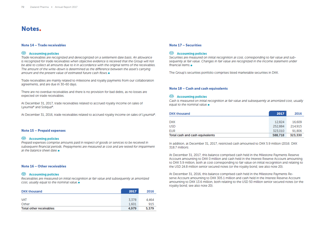 72 Zealand Pharma Annual Report 2017 Notes Note 14 Trade receivables Note 17 Securities Accounting policies Trade receivables are recognized and derecognized on a settlement date basis. An allowance is recognized for trade receivables when objective evidence is received that the Group will not be able to collect all amounts due to it in accordance with the original terms of the receivables. The amount of the write-down is determined as the difference between the assets carrying amount and the present value of estimated future cash flows. Accounting policies Securities are measured on initial recognition at cost, corresponding to fair value and sub-sequently at fair value. Changes in fair value are recognized in the income statement under financial items. The Groups securities portfolio comprises listed marketable securities in DKK. Trade receivables are mainly related to milestone and royalty payments from our collaboration agreements, and are due in 30-60 days. Note 18 Cash and cash equivalents There are no overdue receivables and there is no provision for bad debts, as no losses are expected on trade receivables. Accounting policies Cash is measured on initial recognition at fair value and subsequently at amortized cost, usually equal to the nominal value. At December 31, 2017, trade receivables related to accrued royalty income on sales of Lyxumia® and Soliqua®. DKK thousand 2017 2016 At December 31, 2016, trade receivables related to accrued royalty income on sales of Lyxumia®. Note 15 Prepaid expenses Accounting policies Prepaid expenses comprise amounts paid in respect of goods or services to be received in subsequent financial periods. Prepayments are measured at cost and are tested for impairment at the balance sheet date. In addition, at December 31, 2017, restricted cash amounted to DKK 5.9 million (2016: DKK 318.7 million). At December 31, 2017, this balance comprised cash held in the Milestone Payments Reserve Account amounting to DKK 0 million and cash held in the Interest Reserve Account amounting to DKK 5.9 million, both at cost corresponding to fair value on initial recognition and relating to the USD 24.8 million senior secured notes (or the royalty bond; see also note 20). Note 16 Other receivables At December 31, 2016, this balance comprised cash held in the Milestone Payments Re-serve Account amounting to DKK 305.1 million and cash held in the Interest Reserve Account amounting to DKK 13.6 million, both relating to the USD 50 million senior secured notes (or the royalty bond; see also note 20). Accounting policies Receivables are measured on initial recognition at fair value and subsequently at amortized cost, usually equal to the nominal value. DKK thousand 2017 2016 VAT Other 3,378 1,601 4,464 915 Total other receivables 4,979 5,379 DKK USD EUR 12,824 252,884 323,010 16,609 214,915 91,806 Total cash and cash equivalents 588,718 323,330