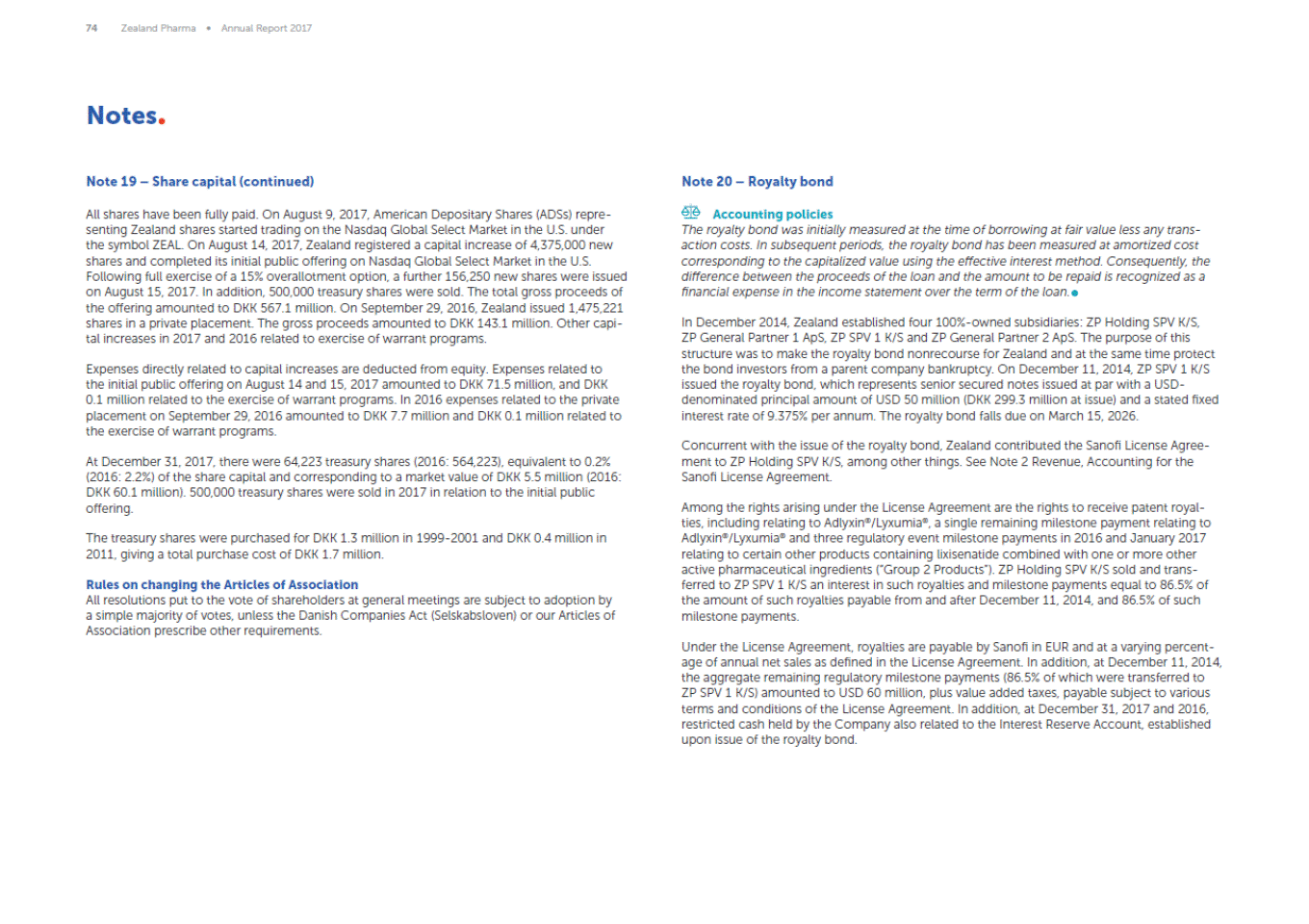 74 Zealand Pharma Annual Report 2017 Notes Note 19 Share capital (continued) Note 20 Royalty bond All shares have been fully paid. On August 9, 2017, American Depositary Shares (ADSs) repre-senting Zealand shares started trading on the Nasdaq Global Select Market in the U.S. under the symbol ZEAL. On August 14, 2017, Zealand registered a capital increase of 4,375,000 new shares and completed its initial public offering on Nasdaq Global Select Market in the U.S. Following full exercise of a 15% overallotment option, a further 156,250 new shares were issued on August 15, 2017. In addition, 500,000 treasury shares were sold. The total gross proceeds of the offering amounted to DKK 567.1 million. On September 29, 2016, Zealand issued 1,475,221 shares in a private placement. The gross proceeds amounted to DKK 143.1 million. Other capi-tal increases in 2017 and 2016 related to exercise of warrant programs. Accounting policies The royalty bond was initially measured at the time of borrowing at fair value less any trans-action costs. In subsequent periods, the royalty bond has been measured at amortized cost corresponding to the capitalized value using the effective interest method. Consequently, the difference between the proceeds of the loan and the amount to be repaid is recognized as a financial expense in the income statement over the term of the loan. In December 2014, Zealand established four 100%-owned subsidiaries: ZP Holding SPV K/S, ZP General Partner 1 ApS, ZP SPV 1 K/S and ZP General Partner 2 ApS. The purpose of this structure was to make the royalty bond nonrecourse for Zealand and at the same time protect the bond investors from a parent company bankruptcy. On December 11, 2014, ZP SPV 1 K/S issued the royalty bond, which represents senior secured notes issued at par with a USD-denominated principal amount of USD 50 million (DKK 299.3 million at issue) and a stated fixed interest rate of 9.375% per annum. The royalty bond falls due on March 15, 2026. Expenses directly related to capital increases are deducted from equity. Expenses related to the initial public offering on August 14 and 15, 2017 amounted to DKK 71.5 million, and DKK 0.1 million related to the exercise of warrant programs. In 2016 expenses related to the private placement on September 29, 2016 amounted to DKK 7.7 million and DKK 0.1 million related to the exercise of warrant programs. Concurrent with the issue of the royalty bond, Zealand contributed the Sanofi License Agree-ment to ZP Holding SPV K/S, among other things. See Note 2 Revenue, Accounting for the Sanofi License Agreement. At December 31, 2017, there were 64,223 treasury shares (2016: 564,223), equivalent to 0.2% (2016: 2.2%) of the share capital and corresponding to a market value of DKK 5.5 million (2016: DKK 60.1 million). 500,000 treasury shares were sold in 2017 in relation to the initial public offering. Among the rights arising under the License Agreement are the rights to receive patent royal-ties, including relating to Adlyxin®/Lyxumia®, a single remaining milestone payment relating to Adlyxin®/Lyxumia® and three regulatory event milestone payments in 2016 and January 2017 relating to certain other products containing lixisenatide combined with one or more other active pharmaceutical ingredients (Group 2 Products). ZP Holding SPV K/S sold and trans-ferred to ZP SPV 1 K/S an interest in such royalties and milestone payments equal to 86.5% of the amount of such royalties payable from and after December 11, 2014, and 86.5% of such milestone payments. The treasury shares were purchased for DKK 1.3 million in 1999-2001 and DKK 0.4 million in 2011, giving a total purchase cost of DKK 1.7 million. Rules on changing the Articles of Association All resolutions put to the vote of shareholders at general meetings are subject to adoption by a simple majority of votes, unless the Danish Companies Act (Selskabsloven) or our Articles of Association prescribe other requirements. Under the License Agreement, royalties are payable by Sanofi in EUR and at a varying percent-age of annual net sales as defined in the License Agreement. In addition, at December 11, 2014, the aggregate remaining regulatory milestone payments (86.5% of which were transferred to ZP SPV 1 K/S) amounted to USD 60 million, plus value added taxes, payable subject to various terms and conditions of the License Agreement. In addition, at December 31, 2017 and 2016, restricted cash held by the Company also related to the Interest Reserve Account, established upon issue of the royalty bond.