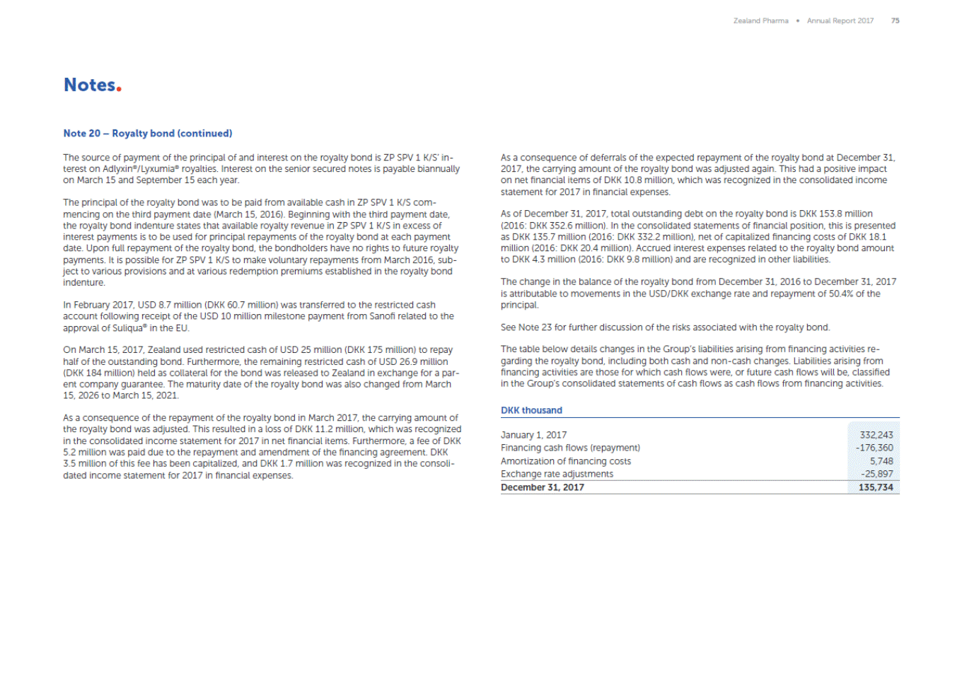 Zealand Pharma Annual Report 2017 75 Notes Note 20 Royalty bond (continued) The source of payment of the principal of and interest on the royalty bond is ZP SPV 1 K/S in-terest on Adlyxin®/Lyxumia® royalties. Interest on the senior secured notes is payable biannually on March 15 and September 15 each year. As a consequence of deferrals of the expected repayment of the royalty bond at December 31, 2017, the carrying amount of the royalty bond was adjusted again. This had a positive impact on net financial items of DKK 10.8 million, which was recognized in the consolidated income statement for 2017 in financial expenses. The principal of the royalty bond was to be paid from available cash in ZP SPV 1 K/S com-mencing on the third payment date (March 15, 2016). Beginning with the third payment date, the royalty bond indenture states that available royalty revenue in ZP SPV 1 K/S in excess of interest payments is to be used for principal repayments of the royalty bond at each payment date. Upon full repayment of the royalty bond, the bondholders have no rights to future royalty payments. It is possible for ZP SPV 1 K/S to make voluntary repayments from March 2016, sub-ject to various provisions and at various redemption premiums established in the royalty bond indenture. As of December 31, 2017, total outstanding debt on the royalty bond is DKK 153.8 million (2016: DKK 352.6 million). In the consolidated statements of financial position, this is presented as DKK 135.7 million (2016: DKK 332.2 million), net of capitalized financing costs of DKK 18.1 million (2016: DKK 20.4 million). Accrued interest expenses related to the royalty bond amount to DKK 4.3 million (2016: DKK 9.8 million) and are recognized in other liabilities. The change in the balance of the royalty bond from December 31, 2016 to December 31, 2017 is attributable to movements in the USD/DKK exchange rate and repayment of 50.4% of the principal. In February 2017, USD 8.7 million (DKK 60.7 million) was transferred to the restricted cash account following receipt of the USD 10 million milestone payment from Sanofi related to the approval of Suliqua® in the EU. See Note 23 for further discussion of the risks associated with the royalty bond. On March 15, 2017, Zealand used restricted cash of USD 25 million (DKK 175 million) to repay half of the outstanding bond. Furthermore, the remaining restricted cash of USD 26.9 million (DKK 184 million) held as collateral for the bond was released to Zealand in exchange for a par-ent company guarantee. The maturity date of the royalty bond was also changed from March 15, 2026 to March 15, 2021. The table below details changes in the Groups liabilities arising from financing activities re-garding the royalty bond, including both cash and non-cash changes. Liabilities arising from financing activities are those for which cash flows were, or future cash flows will be, classified in the Groups consolidated statements of cash flows as cash flows from financing activities. DKK thousand As a consequence of the repayment of the royalty bond in March 2017, the carrying amount of the royalty bond was adjusted. This resulted in a loss of DKK 11.2 million, which was recognized in the consolidated income statement for 2017 in net financial items. Furthermore, a fee of DKK 5.2 million was paid due to the repayment and amendment of the financing agreement. DKK 3.5 million of this fee has been capitalized, and DKK 1.7 million was recognized in the consoli-dated income statement for 2017 in financial expenses. January 1, 2017 Financing cash flows (repayment) Amortization of financing costs Exchange rate adjustments 332,243 -176,360 5,748 -25,897 December 31, 2017 135,734