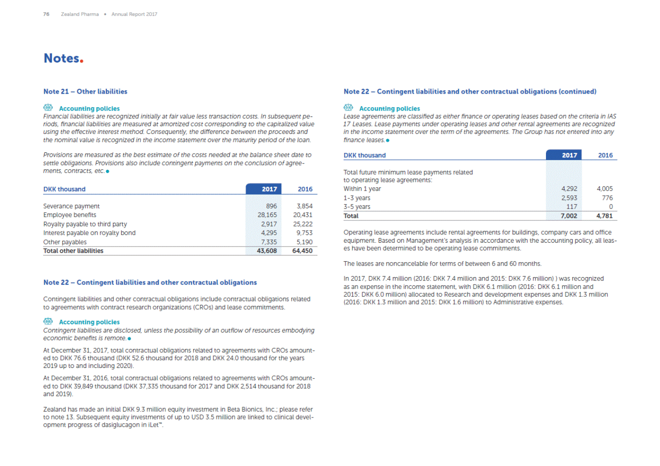 76 Zealand Pharma Annual Report 2017 Notes Note 21 Other liabilities Note 22 Contingent liabilities and other contractual obligations (continued) Accounting policies Financial liabilities are recognized initially at fair value less transaction costs. In subsequent pe-riods, financial liabilities are measured at amortized cost corresponding to the capitalized value using the effective interest method. Consequently, the difference between the proceeds and the nominal value is recognized in the income statement over the maturity period of the loan. Accounting policies Lease agreements are classified as either finance or operating leases based on the criteria in IAS 17 Leases. Lease payments under operating leases and other rental agreements are recognized in the income statement over the term of the agreements. The Group has not entered into any finance leases. Provisions are measured as the best estimate of the costs needed at the balance sheet date to settle obligations. Provisions also include contingent payments on the conclusion of agree-ments, contracts, etc. DKK thousand 2017 2016 2017 DKK thousand 2016 Operating lease agreements include rental agreements for buildings, company cars and office equipment. Based on Managements analysis in accordance with the accounting policy, all leas-es have been determined to be operating lease commitments. The leases are noncancelable for terms of between 6 and 60 months. In 2017, DKK 7.4 million (2016: DKK 7.4 million and 2015: DKK 7.6 million) ) was recognized as an expense in the income statement, with DKK 6.1 million (2016: DKK 6.1 million and 2015: DKK 6.0 million) allocated to Research and development expenses and DKK 1.3 million (2016: DKK 1.3 million and 2015: DKK 1.6 million) to Administrative expenses. Note 22 Contingent liabilities and other contractual obligations Contingent liabilities and other contractual obligations include contractual obligations related to agreements with contract research organizations (CROs) and lease commitments. Accounting policies Contingent liabilities are disclosed, unless the possibility of an outflow of resources embodying economic benefits is remote. At December 31, 2017, total contractual obligations related to agreements with CROs amount-ed to DKK 76.6 thousand (DKK 52.6 thousand for 2018 and DKK 24.0 thousand for the years 2019 up to and including 2020). At December 31, 2016, total contractual obligations related to agreements with CROs amount-ed to DKK 39,849 thousand (DKK 37,335 thousand for 2017 and DKK 2,514 thousand for 2018 and 2019). Zealand has made an initial DKK 9.3 million equity investment in Beta Bionics, Inc.; please refer to note 13. Subsequent equity investments of up to USD 3.5 million are linked to clinical devel-opment progress of dasiglucagon in iLet. Severance payment Employee benefits Royalty payable to third party Interest payable on royalty bond Other payables 896 28,165 2,917 4,295 7,335 3,854 20,431 25,222 9,753 5,190 Total other liabilities 43,608 64,450 Total future minimum lease payments related to operating lease agreements: Within 1 year 1-3 years 3-5 years 4,292 2,593 117 4,005 776 0 Total 7,002 4,781