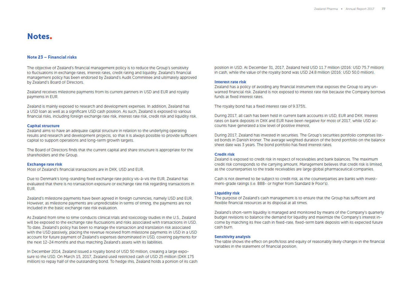 Zealand Pharma Annual Report 2017 77 Notes Note 23 Financial risks The objective of Zealands financial management policy is to reduce the Groups sensitivity to fluctuations in exchange rates, interest rates, credit rating and liquidity. Zealands financial management policy has been endorsed by Zealands Audit Committee and ultimately approved by Zealands Board of Directors. position in USD. At December 31, 2017, Zealand held USD 11.7 million (2016: USD 75.7 million) in cash, while the value of the royalty bond was USD 24.8 million (2016: USD 50.0 million). Interest rate risk Zealand has a policy of avoiding any financial instrument that exposes the Group to any un-wanted financial risk. Zealand is not exposed to interest rate risk because the Company borrows funds at fixed interest rates. Zealand receives milestone payments from its current partners in USD and EUR and royalty payments in EUR. Zealand is mainly exposed to research and development expenses. In addition, Zealand has a USD loan as well as a significant USD cash position. As such, Zealand is exposed to various financial risks, including foreign exchange rate risk, interest rate risk, credit risk and liquidity risk. The royalty bond has a fixed interest rate of 9.375%. During 2017, all cash has been held in current bank accounts in USD, EUR and DKK. Interest rates on bank deposits in DKK and EUR have been negative for most of 2017, while USD ac-counts have generated a low level of positive interest. Capital structure Zealand aims to have an adequate capital structure in relation to the underlying operating results and research and development projects, so that it is always possible to provide sufficient capital to support operations and long-term growth targets. During 2017, Zealand has invested in securities. The Groups securities portfolio comprises list-ed bonds in Danish kroner. The average weighted duration of the bond portfolio on the balance sheet date was 3 years. The bond portfolio has fixed interest rates. The Board of Directors finds that the current capital and share structure is appropriate for the shareholders and the Group. Credit risk Zealand is exposed to credit risk in respect of receivables and bank balances. The maximum credit risk corresponds to the carrying amount. Management believes that credit risk is limited, as the counterparties to the trade receivables are large global pharmaceutical companies. Exchange rate risk Most of Zealands financial transactions are in DKK, USD and EUR. Due to Denmarks long-standing fixed exchange rate policy vis-à-vis the EUR, Zealand has evaluated that there is no transaction exposure or exchange rate risk regarding transactions in EUR. Cash is not deemed to be subject to credit risk, as the counterparties are banks with invest-ment-grade ratings (i.e. BBB-or higher from Standard & Poors). Liquidity risk The purpose of Zealands cash management is to ensure that the Group has sufficient and flexible financial resources at its disposal at all times. Zealands milestone payments have been agreed in foreign currencies, namely USD and EUR. However, as milestone payments are unpredictable in terms of timing, the payments are not included in the basic exchange rate risk evaluation. Zealands short-term liquidity is managed and monitored by means of the Companys quarterly budget revisions to balance the demand for liquidity and maximize the Companys interest in-come by matching its free cash in fixed-rate, fixed-term bank deposits with its expected future cash burn. As Zealand from time to time conducts clinical trials and toxicology studies in the U.S., Zealand will be exposed to the exchange rate fluctuations and risks associated with transactions in USD. To date, Zealands policy has been to manage the transaction and translation risk associated with the USD passively, placing the revenue received from milestone payments in USD in a USD account for future payment of Zealands expenses denominated in USD, covering payments for the next 12-24 months and thus matching Zealands assets with its liabilities. Sensitivity analysis The table shows the effect on profit/loss and equity of reasonably likely changes in the financial variables in the statement of financial position. In December 2014, Zealand issued a royalty bond of USD 50 million, creating a large expo-sure to the USD. On March 15, 2017, Zealand used restricted cash of USD 25 million (DKK 175 million) to repay half of the outstanding bond. To hedge this, Zealand holds a portion of its cash