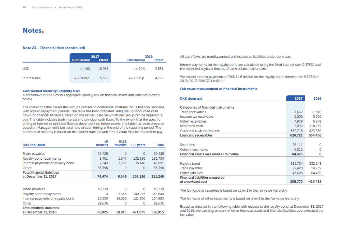 78 Zealand Pharma Annual Report 2017 Notes Note 23 Financial risks (continued) 2017 Effect 2016 Fluctuation All cash flows are nondiscounted and include all liabilities under contracts. Fluctuation Effect Interest payments on the royalty bond are calculated using the fixed interest rate (9.375%) and the expected payback time as of each balance sheet date. We expect interest payments of DKK 14.6 million on the royalty bond (interest rate 9.375%) in 2018 (2017: DKK 33.1 million). Fair value measurement of financial instruments Contractual maturity (liquidity risk) A breakdown of the Groups aggregate liquidity risk on financial assets and liabilities is given below. DKK thousand 2017 2016 The following table details the Groups remaining contractual maturity for its financial liabilities with agreed repayment periods. The table has been prepared using the undiscounted cash flows for financial liabilities, based on the earliest date on which the Group can be required to pay. The table includes both interest and principal cash flows. To the extent that the specific timing of interest or principal flows is dependent on future events, the table has been prepared based on Managements best estimate of such timing at the end of the reporting period. The contractual maturity is based on the earliest date on which the Group may be required to pay. <6 months 6<12 months DKK thousand 1-5 years Total Trade payables Royalty bond repayments Interest payments on royalty bond Other 29,428 1,401 7,249 36,396 0 1,347 7,302 0 0 132,986 35,140 0 29,428 135,734 49,691 36,396 Total financial liabilities at December 31, 2017 74,474 8,649 168,126 251,249 Trade payables Royalty bond repayments Interest payments on royalty bond Other 19,739 0 16,550 29,636 0 3,365 16,550 0 0 349,275 121,800 0 19,739 352,640 154,900 29,636 The fair value of securities is based on Level 1 in the fair value hierarchy. The fair value of other investments is based on level 3 in the fair value hierarchy. Except as detailed in the following table with respect to the royalty bond, at December 31, 2017 and 2016, the carrying amount of other financial assets and financial liabilities approximated the fair value. Total financial liabilities at December 31, 2016 65,925 19,915 471,075 556,915 Categories of financial instruments Trade receivables Income tax receivable Other receivables Restricted cash Cash and cash equivalents 21,632 5,500 4,979 5,892 588,718 11,510 5,500 5,379 318,737 323,330 Loan and receivables 626,721 664,456 Securities Other investments 75,111 9,312 0 0 Financial assets measured at fair value 84,423 0 Royalty bond Trade payables Other liabilities 135,734 29,428 43,608 332,243 19,739 64,450 Financial liabilities measured at amortized cost 208,770 416,432 USD Interest rate +/-10% 10,065 +/-100b.p.5,562 +/-10% 9,531 +/-100b.p.4,728