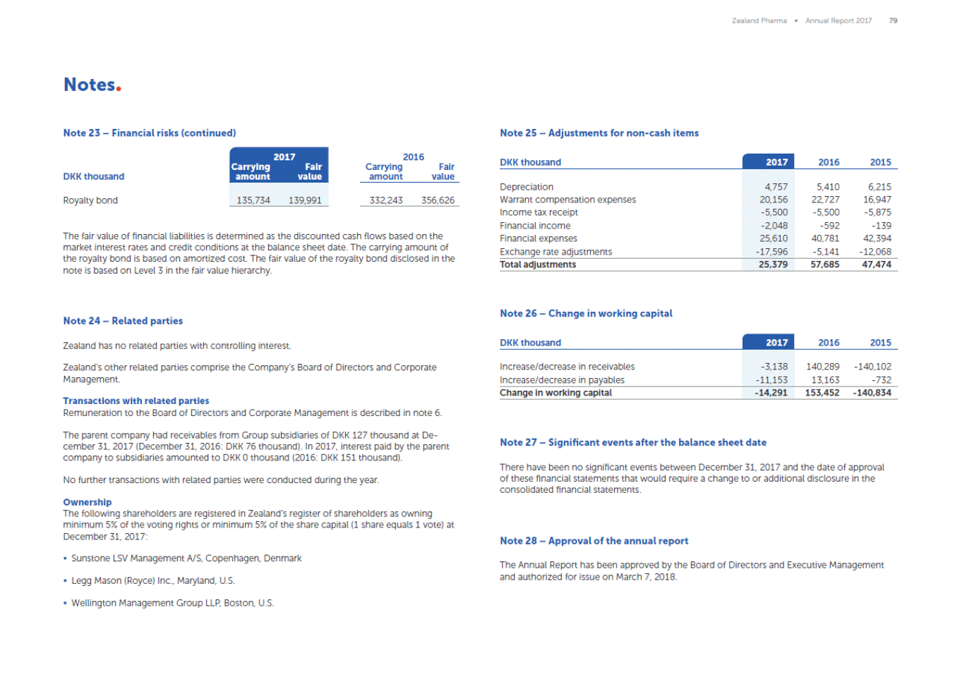 Zealand Pharma Annual Report 2017 79 Notes Note 23 Financial risks (continued) Note 25 Adjustments for non-cash items 2017 2016 2017 DKK thousand 2016 2015 Carrying amount Fair value Carrying amount Fair value DKK thousand Royalty bond 332,243 356,626 The fair value of financial liabilities is determined as the discounted cash flows based on the market interest rates and credit conditions at the balance sheet date. The carrying amount of the royalty bond is based on amortized cost. The fair value of the royalty bond disclosed in the note is based on Level 3 in the fair value hierarchy. Note 26 Change in working capital Note 24 Related parties DKK thousand 2017 2016 2015 Zealand has no related parties with controlling interest. Zealands other related parties comprise the Companys Board of Directors and Corporate Management. Transactions with related parties Remuneration to the Board of Directors and Corporate Management is described in note 6. The parent company had receivables from Group subsidiaries of DKK 127 thousand at De-cember 31, 2017 (December 31, 2016: DKK 76 thousand). In 2017, interest paid by the parent company to subsidiaries amounted to DKK 0 thousand (2016: DKK 151 thousand). Note 27 Significant events after the balance sheet date There have been no significant events between December 31, 2017 and the date of approval of these financial statements that would require a change to or additional disclosure in the consolidated financial statements. No further transactions with related parties were conducted during the year. Ownership The following shareholders are registered in Zealands register of shareholders as owning minimum 5% of the voting rights or minimum 5% of the share capital (1 share equals 1 vote) at December 31, 2017: Note 28 Approval of the annual report Sunstone LSV Management A/S, Copenhagen, Denmark The Annual Report has been approved by the Board of Directors and Executive Management and authorized for issue on March 7, 2018. Legg Mason (Royce) Inc., Maryland, U.S. Wellington Management Group LLP, Boston, U.S. Increase/decrease in receivables Increase/decrease in payables -3,138 -11,153 140,289-140,102 13,163-732 Change in working capital -14,291 153,452 -140,834 135,734139,991 Depreciation Warrant compensation expenses Income tax receipt Financial income Financial expenses Exchange rate adjustments 4,757 20,156 -5,500 -2,048 2,331 3,851 5,4106,215 22,72716,947 -5,500 -5,875 -592 -139 40,78142,394 -5,141 -12,068 Total adjustments 23,547 57,685 47,474