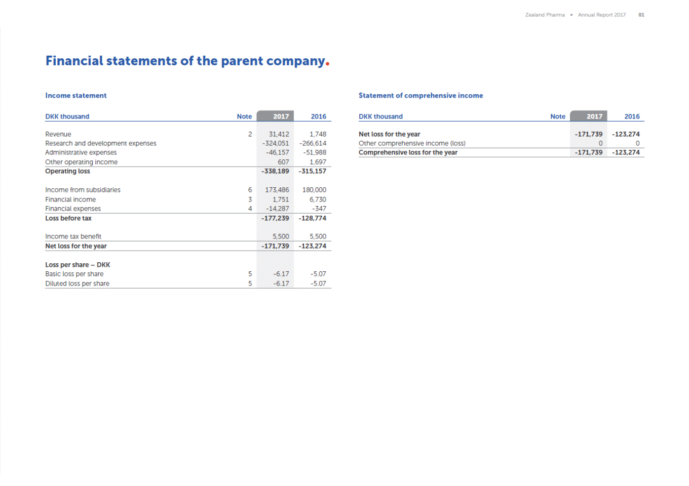Zealand Pharma Annual Report 2017 81 Financial statements of the parent company Income statement Statement of comprehensive income 2017 2017 DKK thousand Note 2016 DKK thousand Note 2016 Revenue Research and development expenses Administrative expenses Other operating income 2 31,412 -324,051 -46,157 607 1,748 -266,614 -51,988 1,697 Net loss for the year Other comprehensive income (loss) -171,739 0 -123,274 0 Comprehensive loss for the year -171,739 -123,274 Operating loss -338,189 -315,157 Income from subsidiaries Financial income Financial expenses 6 3 4 173,486 1,751 -14,287 180,000 6,730 -347 Loss before tax -177,239 -128,774 Income tax benefit 5,500 5,500 Net loss for the year -171,739 -123,274 Loss per share DKK Basic loss per share Diluted loss per share 5 5 -6.17 -6.17 -5.07 -5.07