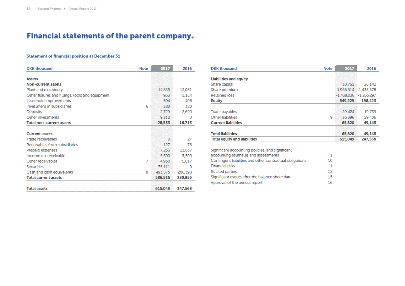 82 Zealand Pharma Annual Report 2017 Financial statements of the parent company Statement of financial position at December 31 2017 2017 DKK thousand Note 2016 DKK thousand Note 2016 Assets Non-current assets Plant and machinery Other fixtures and fittings, tools and equipment Leasehold improvements Investment in subsidiaries Deposits Other investments Liabilities and equity Share capital Share premium Retained loss 30,751 1,956,514 -1,438,036 26,142 1,438,578 -1,266,297 14,855 953 304 380 2,729 9,312 12,081 1,154 408 380 2,690 0 Equity 549,229 198,423 6 Trade payables Other liabilities 29,424 36,396 19,739 29,406 9 Total non-current assets 28,533 16,713 Current liabilities 65,820 49,145 Current assets Trade receivables Receivables from subsidiaries Prepaid expenses Income tax receivable Other receivables Securities Cash and cash equivalents Total liabilities 65,820 49,145 0 127 7,253 5,500 4,950 75,111 493,575 27 76 13,837 5,500 5,017 0 206,398 Total equity and liabilities 615,049 247,568 Significant accounting policies, and significant accounting estimates and assessments Contingent liabilities and other contractual obligations Financial risks Related parties Significant events after the balance sheet date Approval of the annual report 1 10 11 12 15 16 7 8 Total current assets 586,516 230,855 Total assets 615,049 247,568