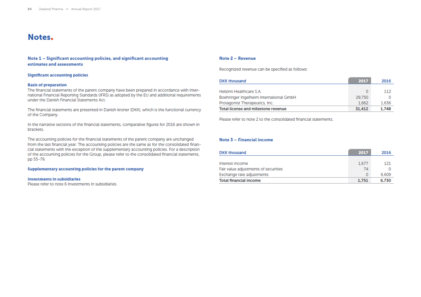 84 Zealand Pharma Annual Report 2017 Notes Note 1 Significant accounting policies, and significant accounting estimates and assessments Note 2 Revenue Recognized revenue can be specified as follows: Significant accounting policies DKK thousand 2017 2016 Basis of preparation The financial statements of the parent company have been prepared in accordance with Inter-national Financial Reporting Standards (IFRS) as adopted by the EU and additional requirements under the Danish Financial Statements Act. Helsinn Healthcare S.A. Boehringer Ingelheim International GmbH Protagonist Therapeutics, Inc. 0 29,750 1,662 112 0 1,636 Total license and milestone revenue 31,412 1,748 The financial statements are presented in Danish kroner (DKK), which is the functional currency of the Company. Please refer to note 2 to the consolidated financial statements. In the narrative sections of the financial statements, comparative figures for 2016 are shown in brackets. The accounting policies for the financial statements of the parent company are unchanged from the last financial year. The accounting policies are the same as for the consolidated finan-cial statements with the exception of the supplementary accounting policies. For a description of the accounting policies for the Group, please refer to the consolidated financial statements, pp 55-79. Note 3 Financial income 2017 DKK thousand 2016 Interest income Fair value adjustments of securities Exchange rate adjustments 1,677 74 0 121 0 6,609 Supplementary accounting policies for the parent company Investments in subsidiaries Please refer to note 6 Investments in subsidiaries. Total financial income 1,751 6,730