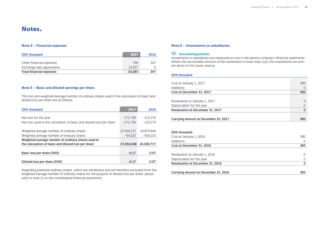 Zealand Pharma Annual Report 2017 85 Notes Note 4 Financial expenses Note 6 Investments in subsidiaries Accounting policies Investments in subsidiaries are measured at cost in the parent companys financial statements. Where the recoverable amount of the investment is lower than cost, the investments are writ-ten down to this lower value. DKK thousand 2017 2016 Other financial expenses Exchange rate adjustments 730 13,557 347 0 Total financial expenses 14,287 347 DKK thousand Cost at January 1, 2017 Additions 380 0 Note 5 Basic and diluted earnings per share Cost at December 31, 2017 380 The loss and weighted average number of ordinary shares used in the calculation of basic and diluted loss per share are as follows: Revaluation at January 1, 2017 Depreciation for the year 0 0 DKK thousand 2017 2016 Revaluation at December 31, 2017 0 Net loss for the year Net loss used in the calculation of basic and diluted loss per share -171,739 -171,739 -123,274 -123,274 Carrying amount at December 31, 2017 380 Weighted average number of ordinary shares Weighted average number of treasury shares 27,918,271 -64,223 24,873,940 -564,223 DKK thousand Cost at January 1, 2016 Additions 380 0 Weighted average number of ordinary shares used in the calculation of basic and diluted loss per share 27,854,048 24,309,717 Cost at December 31, 2016 380 Basic loss per share (DKK) -6.17 -5.07 Revaluation at January 1, 2016 Depreciation for the year 0 0 Diluted loss per share (DKK) -6.17 -5.07 Revaluation at December 31, 2016 0 Regarding potential ordinary shares, which are antidilutive and are therefore excluded from the weighted average number of ordinary shares for the purpose of diluted loss per share, please refer to note 11 to the consolidated financial statements. Carrying amount at December 31, 2016 380