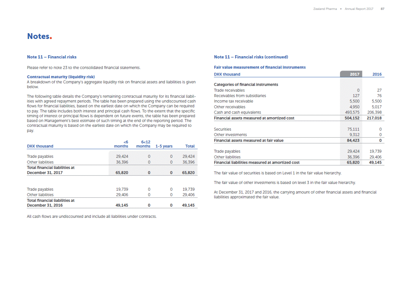 Zealand Pharma Annual Report 2017 87 Notes Note 11 Financial risks Note 11 Financial risks (continued) Please refer to note 23 to the consolidated financial statements. Fair value measurement of financial instruments DKK thousand 2017 2016 Contractual maturity (liquidity risk) A breakdown of the Companys aggregate liquidity risk on financial assets and liabilities is given below. Categories of financial instruments Trade receivables Receivables from subsidiaries Income tax receivable Other receivables Cash and cash equivalents 0 127 5,500 4,950 493,575 27 76 5,500 5,017 206,398 The following table details the Companys remaining contractual maturity for its financial liabil-ities with agreed repayment periods. The table has been prepared using the undiscounted cash flows for financial liabilities, based on the earliest date on which the Company can be required to pay. The table includes both interest and principal cash flows. To the extent that the specific timing of interest or principal flows is dependent on future events, the table has been prepared based on Managements best estimate of such timing at the end of the reporting period. The contractual maturity is based on the earliest date on which the Company may be required to pay. Financial assets measured at amortized cost 504,152 217,018 Securities Other investments 75,111 9,312 0 0 Financial assets measured at fair value 84,423 0 <6 months 6<12 months DKK thousand 1-5 years Total Trade payables Other liabilities 29,424 36,396 19,739 29,406 Trade payables Other liabilities 29,424 36,396 0 0 0 0 29,424 36,396 Financial liabilities measured at amortized cost 65,820 49,145 Total financial liabilities at December 31, 2017 65,820 0 0 65,820 The fair value of securities is based on Level 1 in the fair value hierarchy. The fair value of other investments is based on level 3 in the fair value hierarchy. Trade payables Other liabilities 19,739 29,406 0 0 0 0 19,739 29,406 At December 31, 2017 and 2016, the carrying amount of other financial assets and financial liabilities approximated the fair value. Total financial liabilities at December 31, 2016 49,145 0 0 49,145 All cash flows are undiscounted and include all liabilities under contracts.