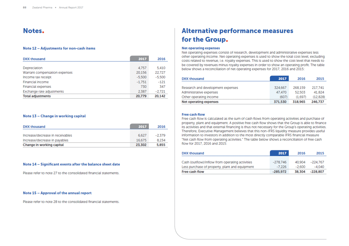 88 Zealand Pharma Annual Report 2017 Notes Alternative Performance Measures Note 12 Adjustments for non-cash items Net operating expenses Net operating expenses consist of research, development and administrative expenses less other operating income. Net operating expenses is used to show the total cost level, excluding costs related to revenue, i.e royalty expenses. This is used to show the cost level that needs to be covered by revenues minus royalty expenses in order to show a positive operational result. The table below shows a reconciliation of net operating expenses for 2017, 2016 and 2015: 2017 DKK thousand 2016 Depreciation Warrant compensation expenses Income tax receipt Financial income Financial expenses Exchange rate adjustments 4,757 20,156 -5,500 0 0 950 5,410 22,727 -5,500 -121 347 -2,721 DKK thousand 2017 2016 2015 Total adjustments 20,363 20,142 Free cash flow Free cash flow is calculated as cash flow from operating activities less purchase of proper-ty, plant and equipment. A positive free cash flow shows that the Group is able to finance its activities and that external financing is thus not necessary for the Groups operating activities. Therefore, Management believes that this non-IFRS liquidity measure provides useful informa-tion to investors in addition to the most directly comparable IFRS financial measure Net cash flow from operating activities. The table below shows a reconciliation of free cash flow for 2017, 2016 and 2015: Note 13 Change in working capital DKK thousand 2017 2016 Increase/decrease in receivables Increase/decrease in payables 6,627 16,675 -2,379 8,234 Change in working capital 23,302 5,855 DKK thousand 2017 2016 2015 Note 14 Significant events after the balance sheet date Please refer to note 27 to the consolidated financial statements. Note 15 Approval of the annual report Please refer to note 28 to the consolidated financial statements. Cash (outflow)/inflow from operating activities Less purchase of property, plant and equipment -278,746 -7,226 40,904-224,767 -2,600 -4,040 Free cash flow -285,972 38,304 -228,807 Research and development expenses Administrative expenses Other operating income 324,667 47,470 (607) 268,159217,741 52,50341,824 (1,697)(12,828) Net operating expenses 371,530 318,965 246,737
