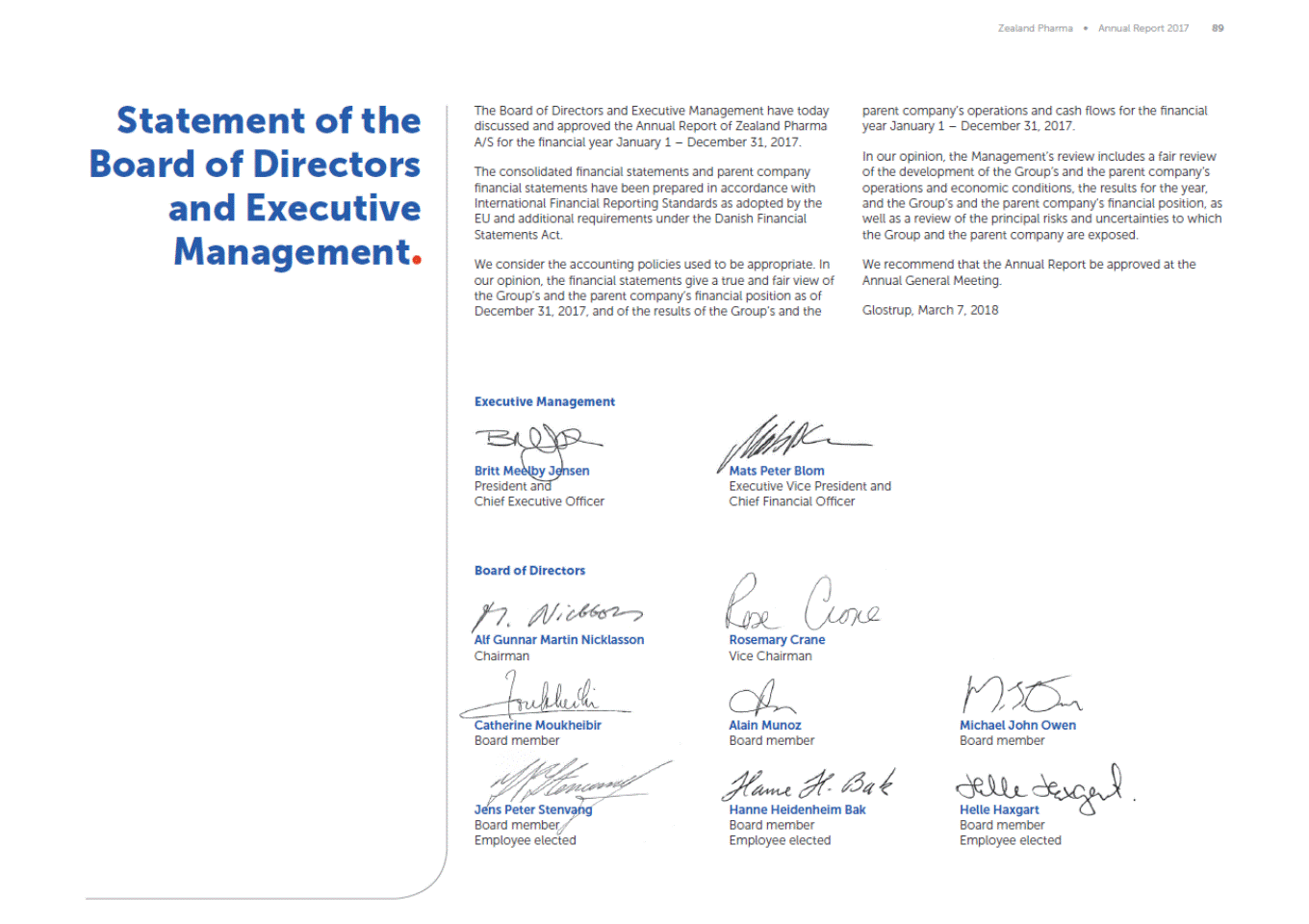 Zealand Pharma Annual Report 2017 89 Statement of the Board of Directors and Corporate Management The Board of Directors and Executive Management have today discussed and approved the Annual Report of Zealand Pharma A/S for the financial year January 1 December 31, 2017. parent companys operations and cash flows for the financial year January 1 December 31, 2017. In our opinion, the Managements review includes a fair review of the development of the Groups and the parent companys operations and economic conditions, the results for the year, and the Groups and the parent companys financial position, as well as a review of the principal risks and uncertainties to which the Group and the parent company are exposed. The consolidated financial statements and parent company financial statements have been prepared in accordance with International Financial Reporting Standards as adopted by the EU and additional requirements under the Danish Financial Statements Act. We consider the accounting policies used to be appropriate. In our opinion, the financial statements give a true and fair view of the Groups and the parent companys financial position as of December 31, 2017, and of the results of the Groups and the We recommend that the Annual Report be approved at the Annual General Meeting. Glostrup, March 7, 2018 Executive Management Britt Meelby Jensen President and Chief Executive Officer Mats Peter Blom Executive Vice President and Chief Financial Officer Board of Directors Alf Gunnar Martin Nicklasson Chairman Rosemary Crane Vice Chairman Catherine Moukheibir Board member Alain Munoz Board member Michael John Owen Board member Jens Peter Stenvang Board member Employee elected Hanne Heidenheim Bak Board member Employee elected Helle Haxgart Board member Employee elected