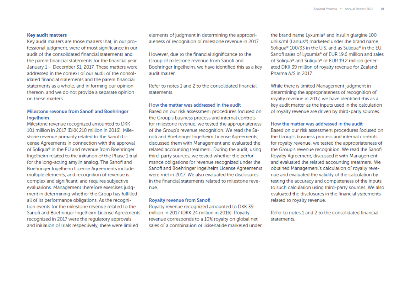 Zealand Pharma Annual Report 201791 the brand name Lyxumia® and insulin glargine 100 units/ml (Lantus®) marketed under the brand name Soliqua® 100/33 in the U.S. and as Suliqua® in the EU. Sanofi sales of Lyxumia® of EUR 19.6 million and sales of Soliqua® and Suliqua® of EUR 19.2 million gener-ated DKK 39 million of royalty revenue for Zealand Pharma A/S in 2017. Key audit matters Key audit matters are those matters that, in our pro-fessional judgment, were of most significance in our audit of the consolidated financial statements and the parent financial statements for the financial year January 1 December 31, 2017. These matters were addressed in the context of our audit of the consol-idated financial statements and the parent financial statements as a whole, and in forming our opinion thereon, and we do not provide a separate opinion on these matters. elements of judgment in determining the appropri-ateness of recognition of milestone revenue in 2017. However, due to the financial significance to the Group of milestone revenue from Sanofi and Boehringer Ingelheim, we have identified this as a key audit matter. Refer to notes 1 and 2 to the consolidated financial statements. While there is limited Management judgment in determining the appropriateness of recognition of royalty revenue in 2017, we have identified this as a key audit matter as the inputs used in the calculation of royalty revenue are driven by third-party sources. How the matter was addressed in the audit Based on our risk assessment procedures focused on the Groups business process and internal controls for milestone revenue, we tested the appropriateness of the Groups revenue recognition. We read the Sa-nofi and Boehringer Ingelheim License Agreements, discussed them with Management and evaluated the related accounting treatment. During the audit, using third-party sources, we tested whether the perfor-mance obligations for revenue recognized under the Sanofi and Boehringer Ingelheim License Agreements were met in 2017. We also evaluated the disclosures in the financial statements related to milestone reve-nue. Milestone revenue from Sanofi and Boehringer Ingelheim Milestone revenue recognized amounted to DKK 101 million in 2017 (DKK 210 million in 2016). Mile-stone revenue primarily related to the Sanofi Li-cense Agreements in connection with the approval of Soliqua® in the EU and revenue from Boehringer Ingelheim related to the initiation of the Phase 1 trial for the long-acting amylin analog. The Sanofi and Boehringer Ingelheim License Agreements include multiple elements, and recognition of revenue is complex and significant, and requires subjective evaluations. Management therefore exercises judg-ment in determining whether the Group has fulfilled all of its performance obligations. As the recogni-tion events for the milestone revenue related to the Sanofi and Boehringer Ingelheim License Agreements recognized in 2017 were the regulatory approvals and initiation of trials respectively, there were limited How the matter was addressed in the audit Based on our risk assessment procedures focused on the Groups business process and internal controls for royalty revenue, we tested the appropriateness of the Groups revenue recognition. We read the Sanofi Royalty Agreement, discussed it with Management and evaluated the related accounting treatment. We obtained Managements calculation of royalty reve-nue and evaluated the validity of the calculation by testing the accuracy and completeness of the inputs to such calculation using third-party sources. We also evaluated the disclosures in the financial statements related to royalty revenue. Royalty revenue from Sanofi Royalty revenue recognized amounted to DKK 39 million in 2017 (DKK 24 million in 2016). Royalty revenue corresponds to a 10% royalty on global net sales of a combination of lixisenatide marketed under Refer to notes 1 and 2 to the consolidated financial statements.
