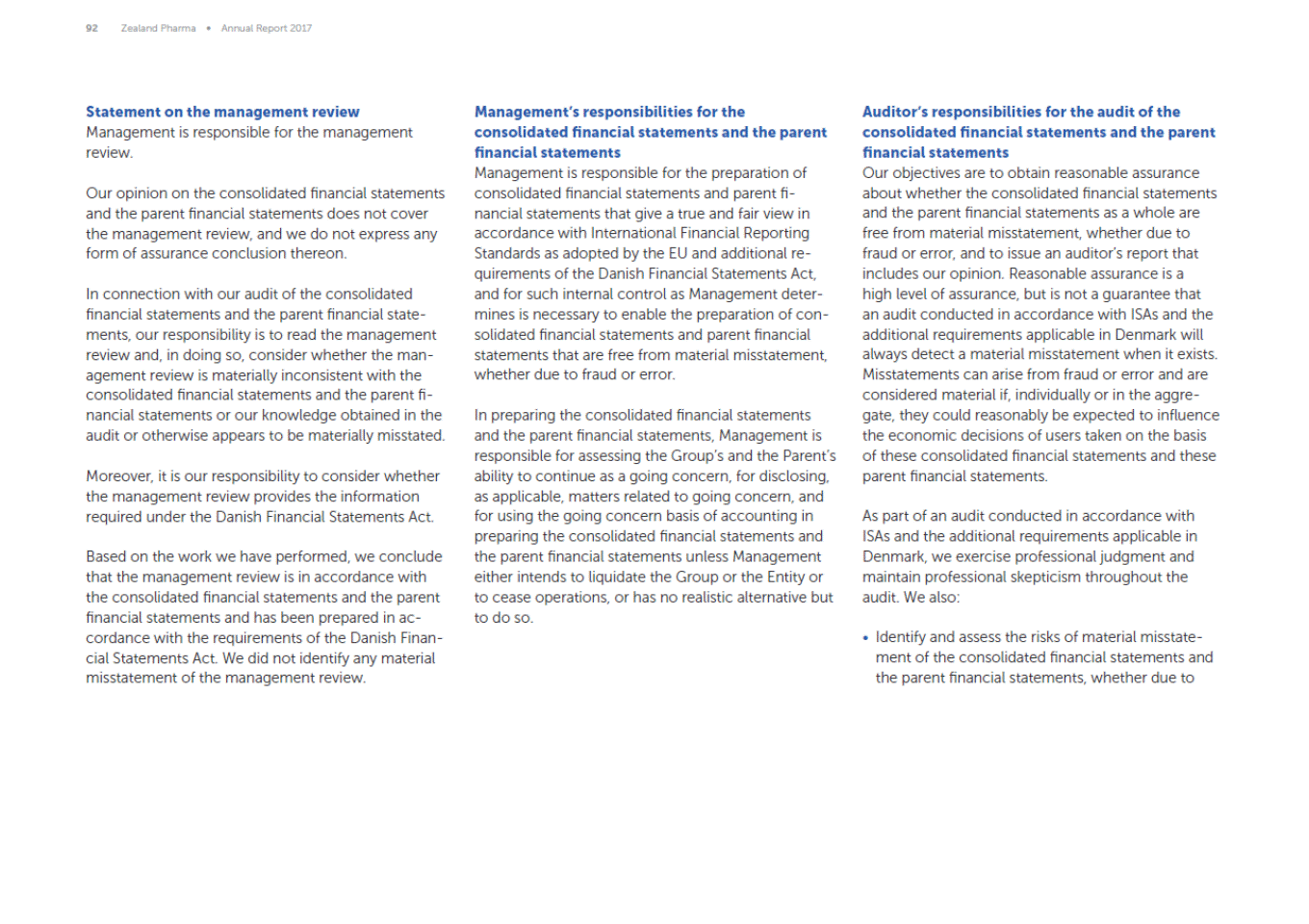 92 Zealand Pharma Annual Report 2017 Managements responsibilities for the consolidated financial statements and the parent financial statements Management is responsible for the preparation of consolidated financial statements and parent fi-nancial statements that give a true and fair view in accordance with International Financial Reporting Standards as adopted by the EU and additional re-quirements of the Danish Financial Statements Act, and for such internal control as Management deter-mines is necessary to enable the preparation of con-solidated financial statements and parent financial statements that are free from material misstatement, whether due to fraud or error. Auditors responsibilities for the audit of the consolidated financial statements and the parent financial statements Our objectives are to obtain reasonable assurance about whether the consolidated financial statements and the parent financial statements as a whole are free from material misstatement, whether due to fraud or error, and to issue an auditors report that includes our opinion. Reasonable assurance is a high level of assurance, but is not a guarantee that an audit conducted in accordance with ISAs and the additional requirements applicable in Denmark will always detect a material misstatement when it exists. Misstatements can arise from fraud or error and are considered material if, individually or in the aggre-gate, they could reasonably be expected to influence the economic decisions of users taken on the basis of these consolidated financial statements and these parent financial statements. Statement on the management review Management is responsible for the management review. Our opinion on the consolidated financial statements and the parent financial statements does not cover the management review, and we do not express any form of assurance conclusion thereon. In connection with our audit of the consolidated financial statements and the parent financial state-ments, our responsibility is to read the management review and, in doing so, consider whether the man-agement review is materially inconsistent with the consolidated financial statements and the parent fi-nancial statements or our knowledge obtained in the audit or otherwise appears to be materially misstated. In preparing the consolidated financial statements and the parent financial statements, Management is responsible for assessing the Groups and the Parents ability to continue as a going concern, for disclosing, as applicable, matters related to going concern, and for using the going concern basis of accounting in preparing the consolidated financial statements and the parent financial statements unless Management either intends to liquidate the Group or the Entity or to cease operations, or has no realistic alternative but to do so. Moreover, it is our responsibility to consider whether the management review provides the information required under the Danish Financial Statements Act. As part of an audit conducted in accordance with ISAs and the additional requirements applicable in Denmark, we exercise professional judgment and maintain professional skepticism throughout the audit. We also: Based on the work we have performed, we conclude that the management review is in accordance with the consolidated financial statements and the parent financial statements and has been prepared in ac-cordance with the requirements of the Danish Finan-cial Statements Act. We did not identify any material misstatement of the management review. Identify and assess the risks of material misstate-ment of the consolidated financial statements and the parent financial statements, whether due to